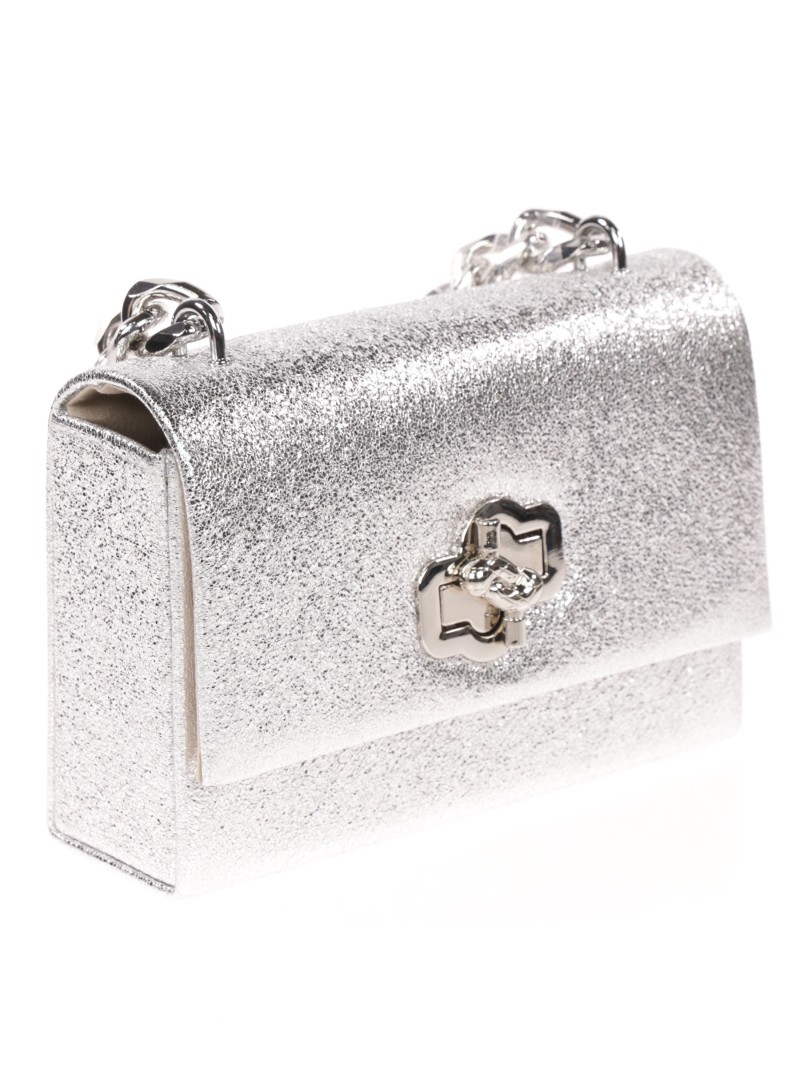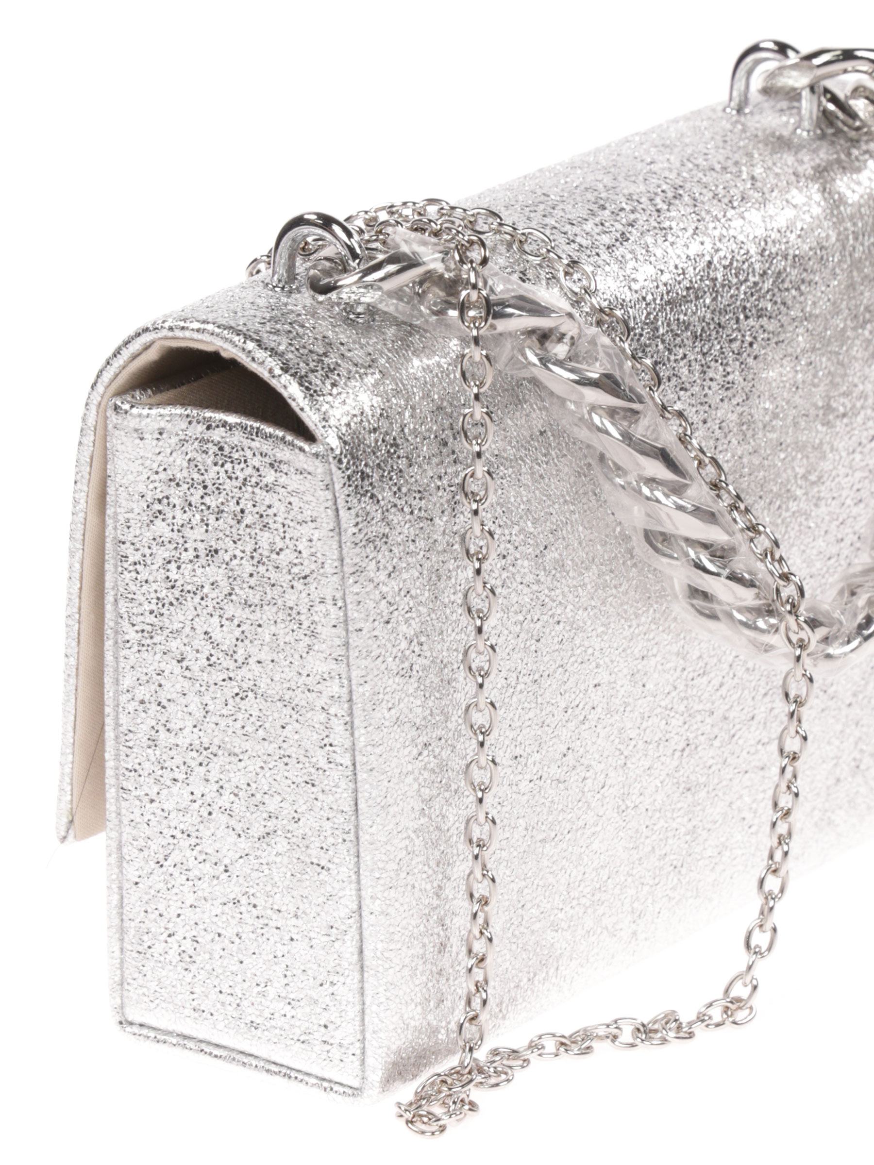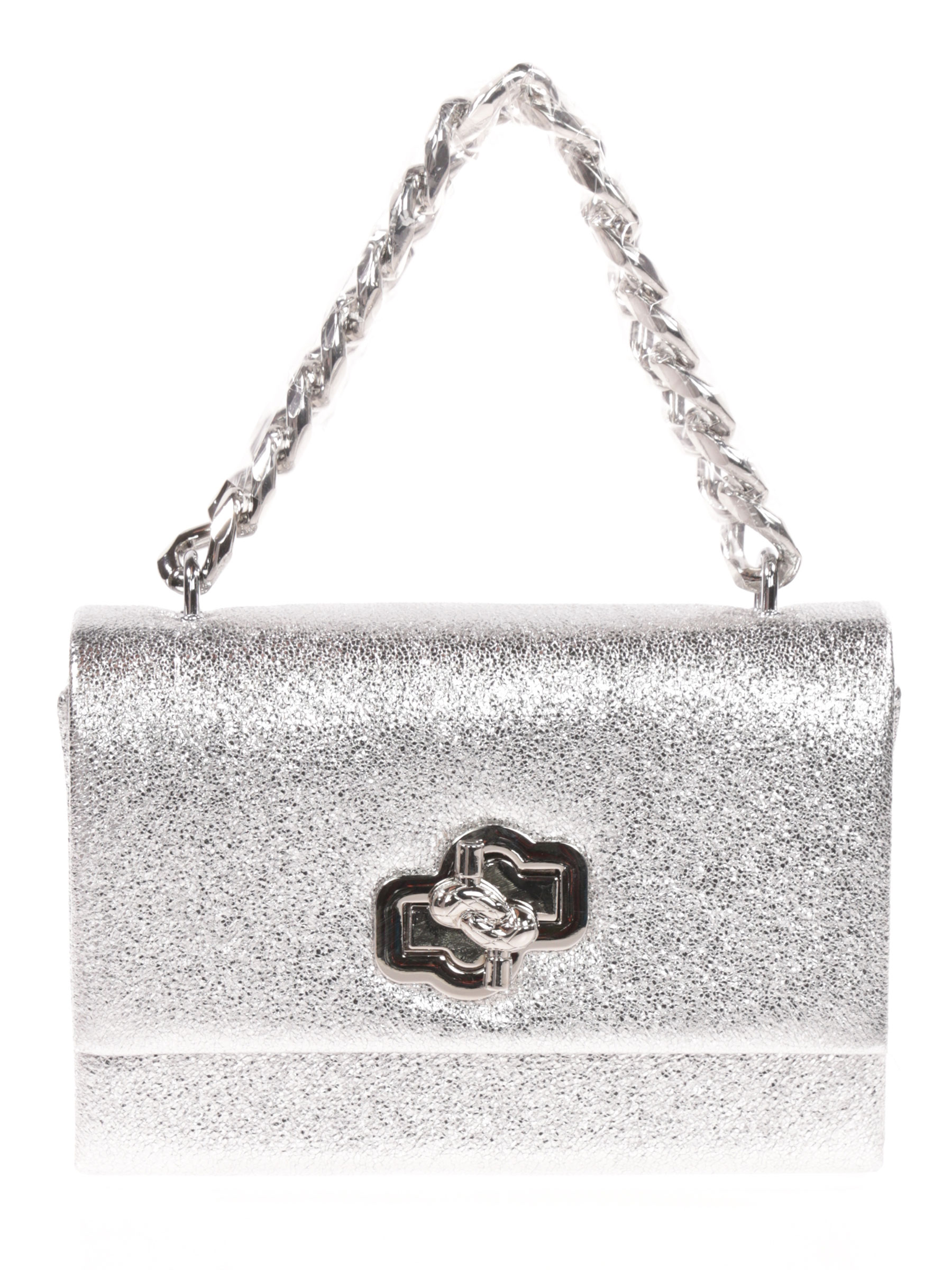 Bolso de fiesta. Material polipiel. Efecto metalizado. Asa de mano. Asa de hombro en cadena. Forro con bolsillo interior. Cierre metálico plateado.