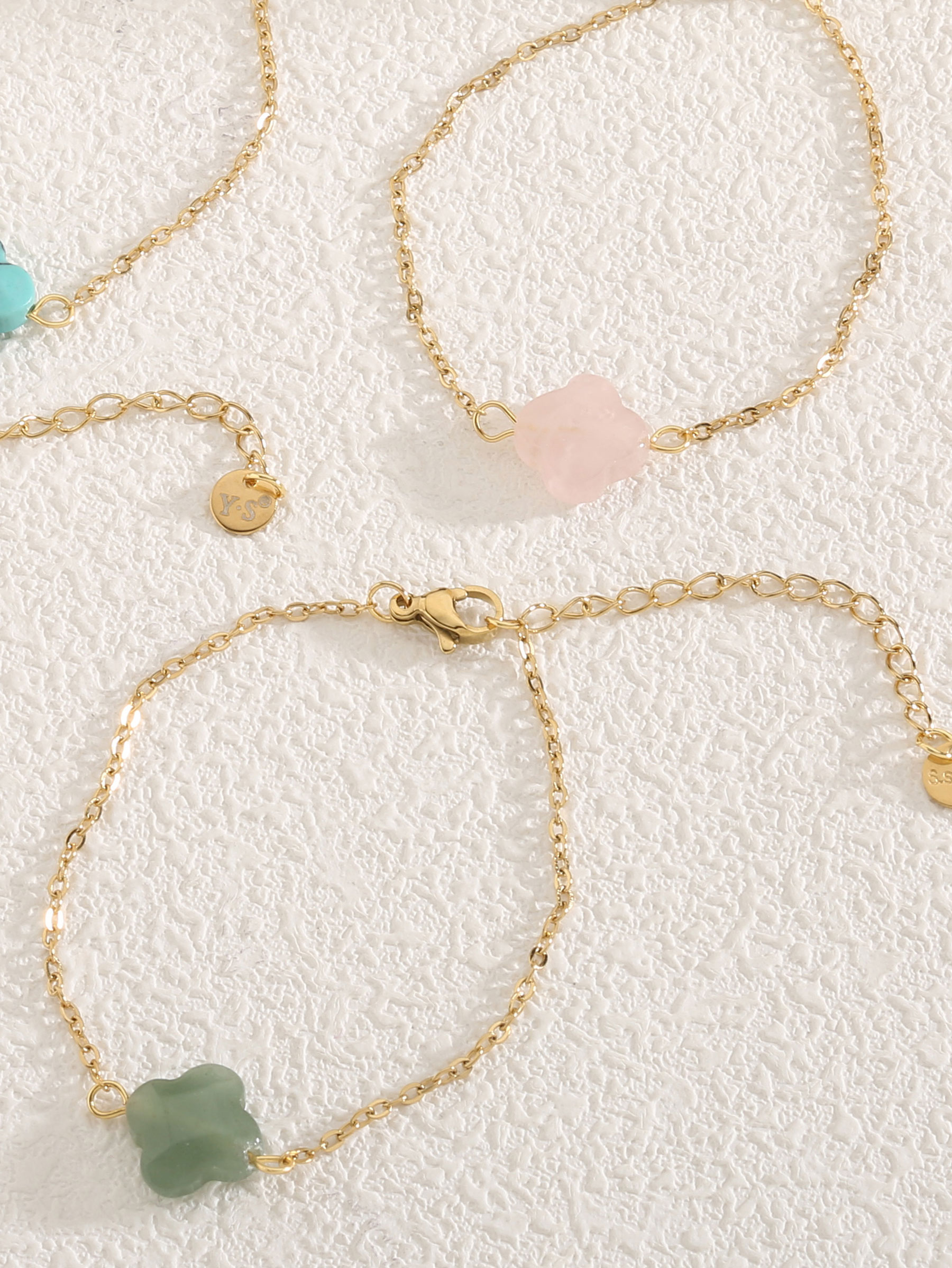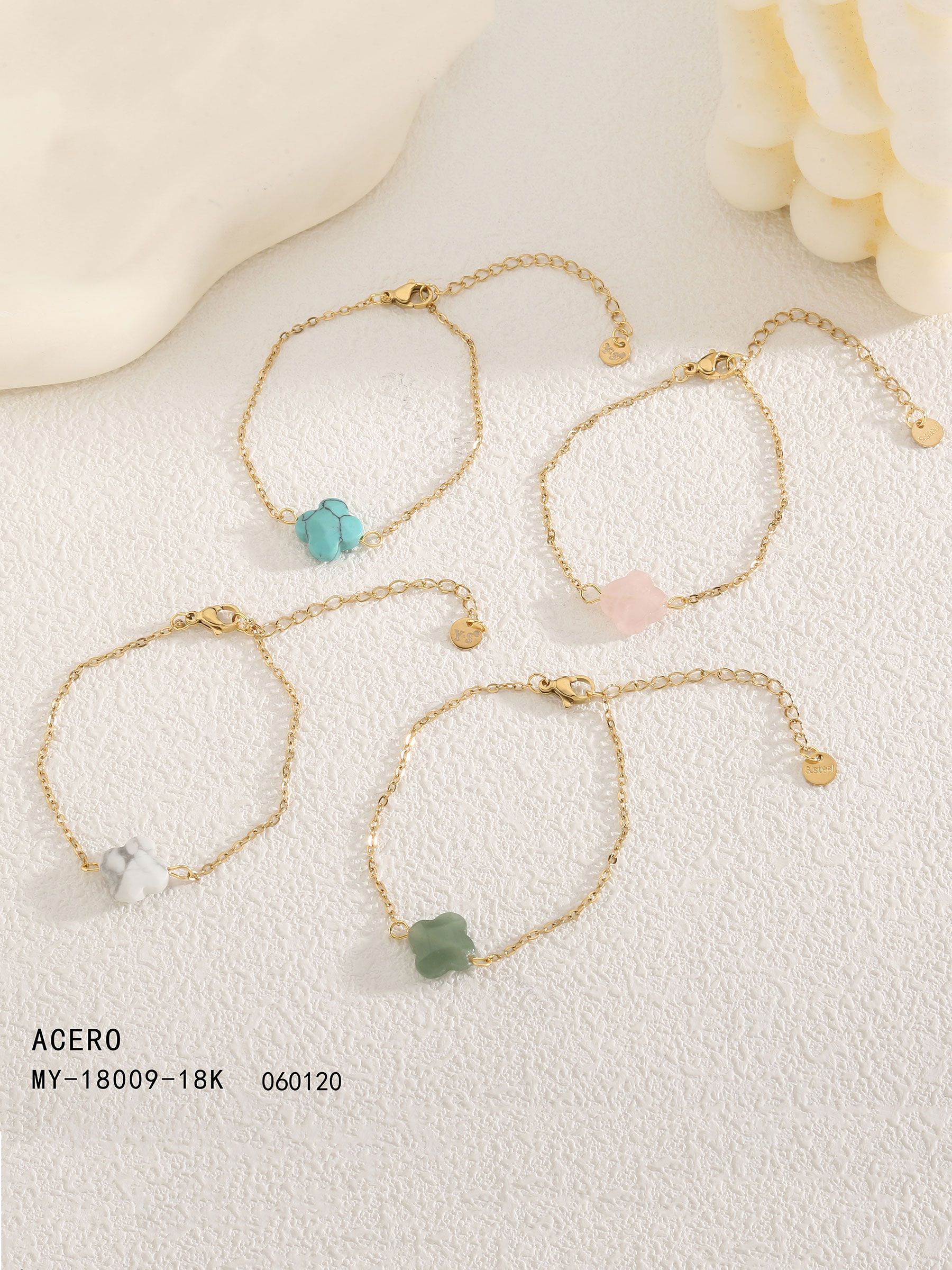 Pulsera trébol de resina con efecto piedra. Acero inoxidable. Colores surtidos.