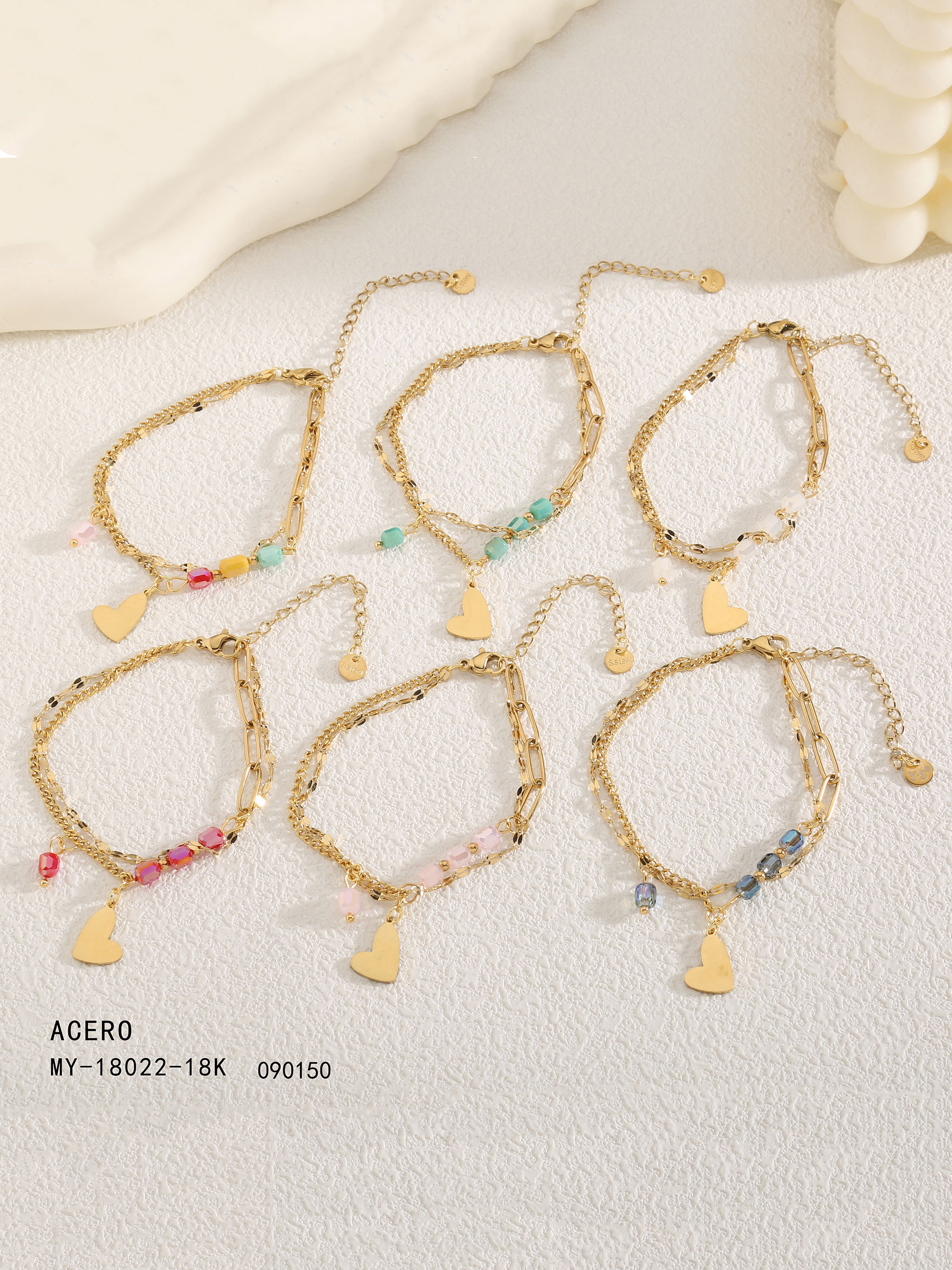 Pulsera doble abalorios de resina charm corazón. Acero inoxidable. Colores surtidos.