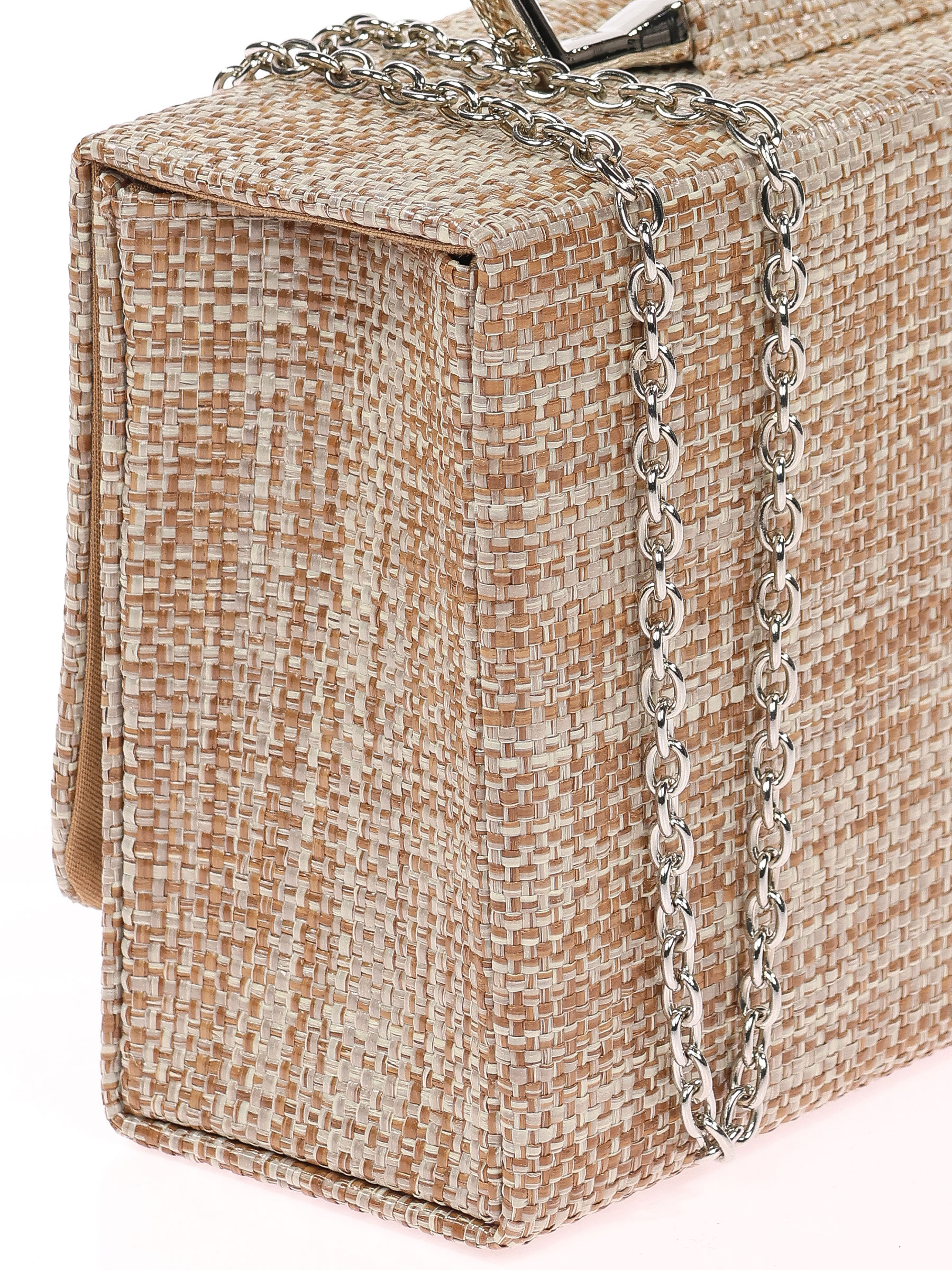 Bolso de fiesta. Efecto rafia. Asa de mano. Asa de hombro en cadena. Forro con bolsillo interior. Cierre mediante imán.
