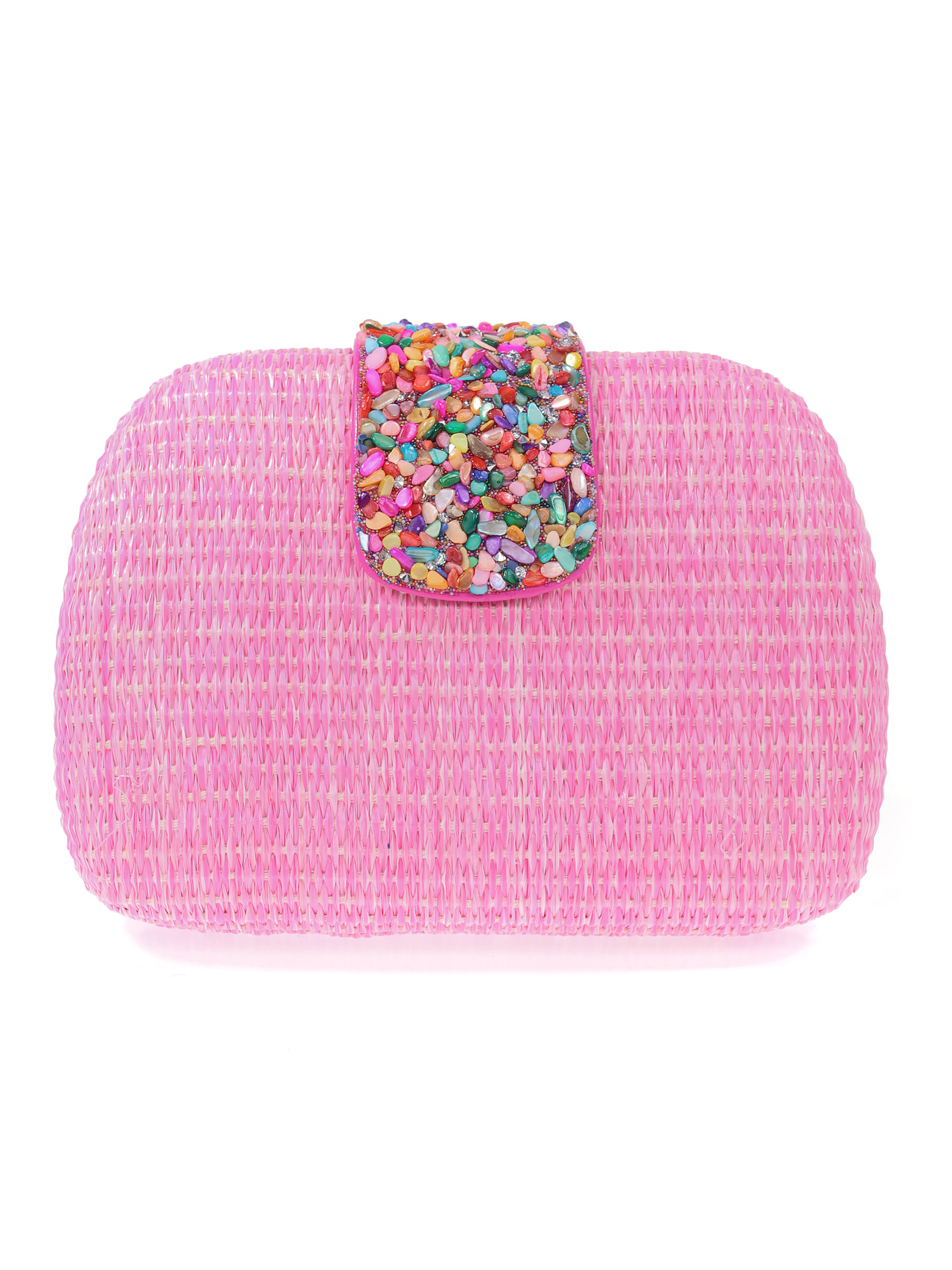 Bolso clutch de fiesta efecto rafia abalorio fucsia