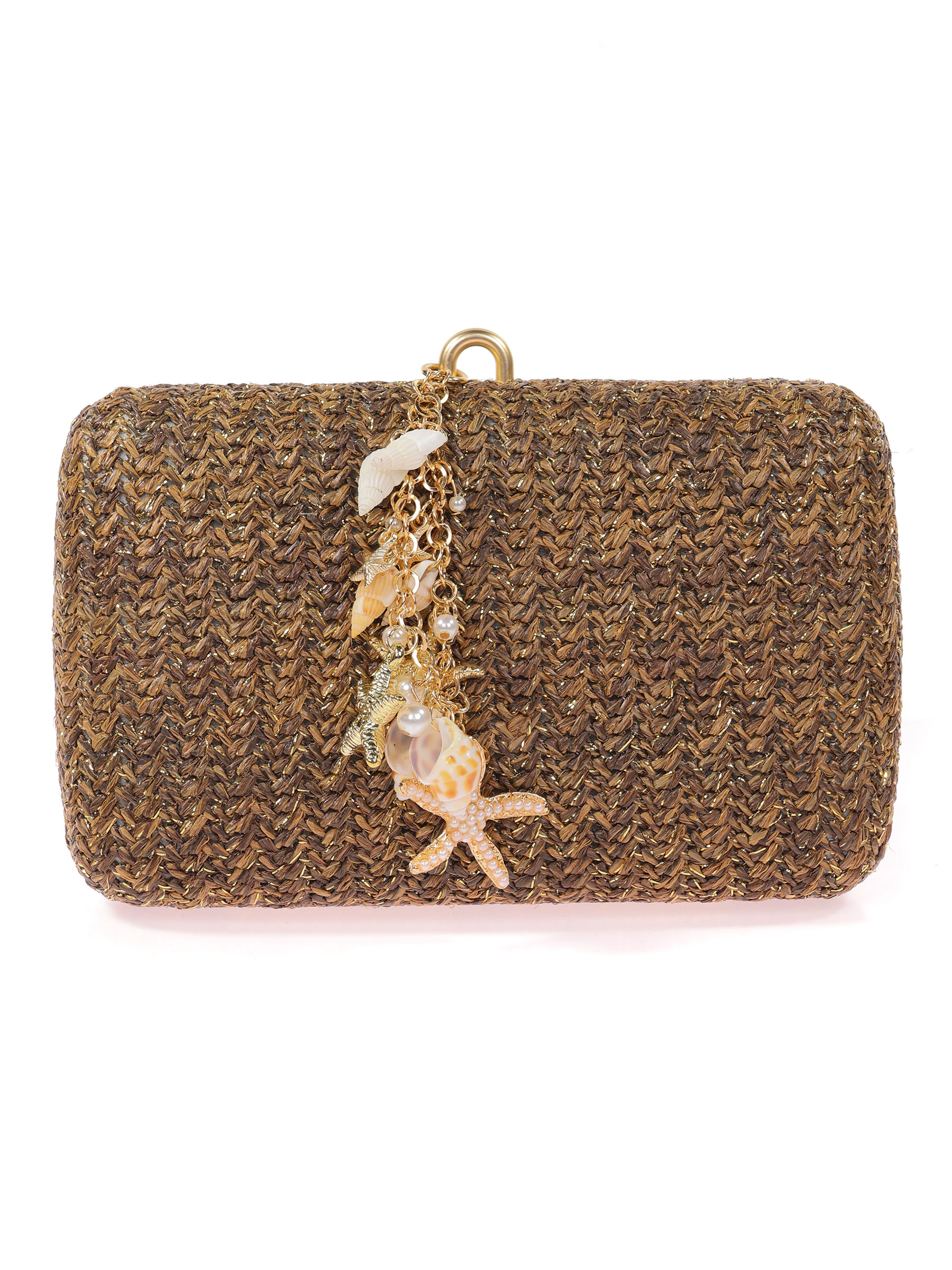 Bolso clutch de fiesta efecto rafia conchas cafe