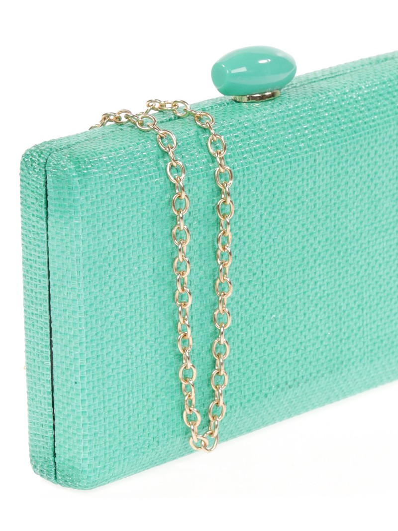 Bolso de fiesta. Efecto rafia. Detalle abalorio de efecto piedra. Asa de hombro en cadena. Forro sin bolsillo interior. Cierre metálico.