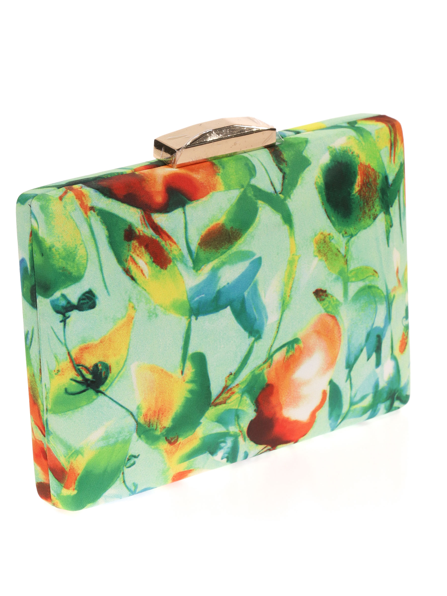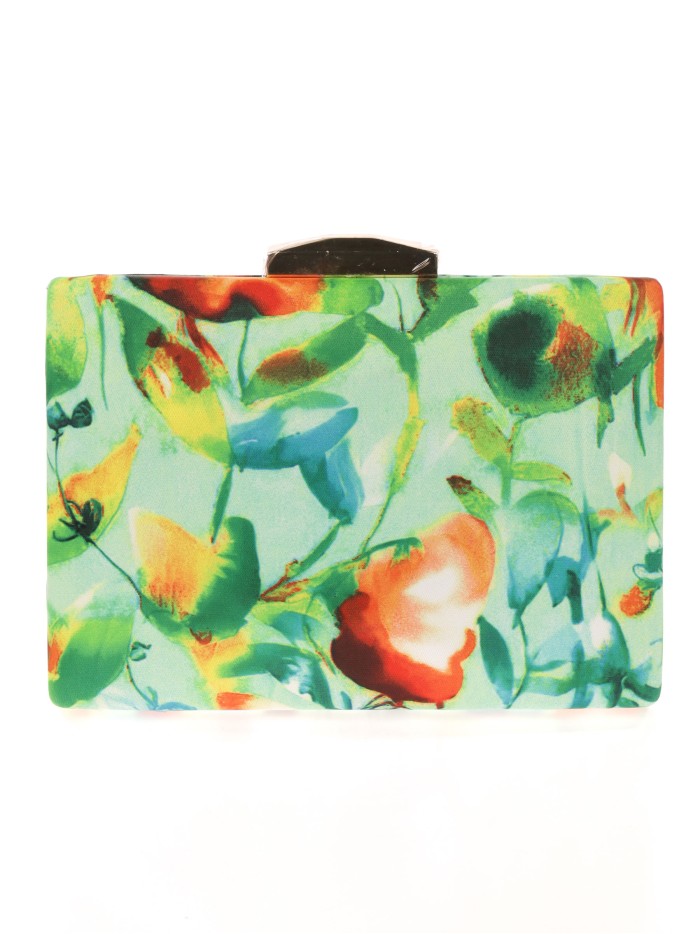 Bolso de fiesta. Tela de tacto suave. Detalle estampado en ambos lados. Asa de hombro en cadena. Forro sin bolsillo interior. Cierre metálico dorado.