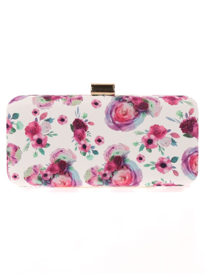 Bolso de fiesta. Tela estampada de flores en ambos lados. Asa de hombro en cadena. Forro sin bolsillo interior. Cierre metálico dorado.