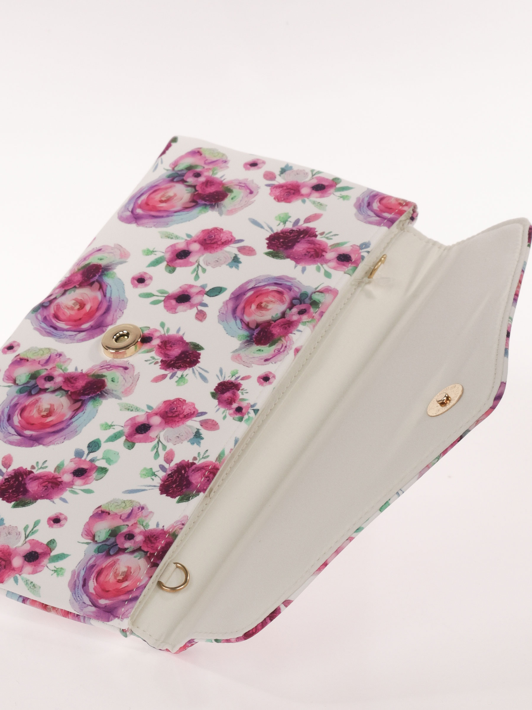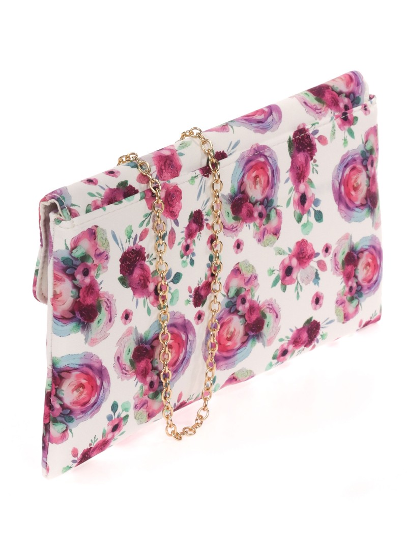 Bolso de fiesta. Tela estampada de flores en ambos lados. Asa de hombro en cadena. Bolsillo interior con cremallera. Cierre mediante imán.
