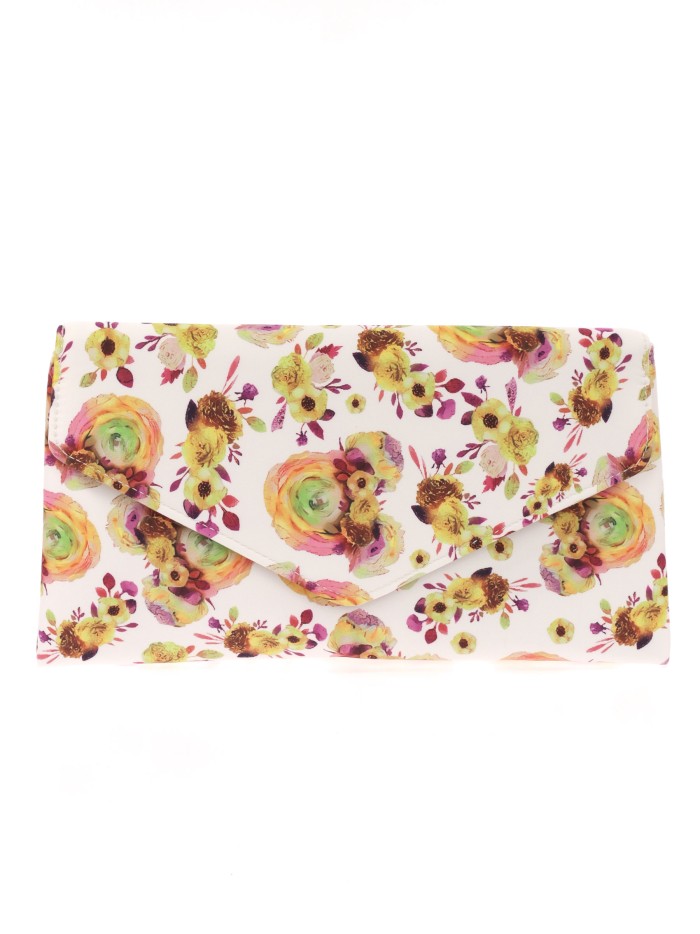 Bolso de fiesta. Tela estampada de flores en ambos lados. Asa de hombro en cadena. Bolsillo interior con cremallera. Cierre mediante imán.