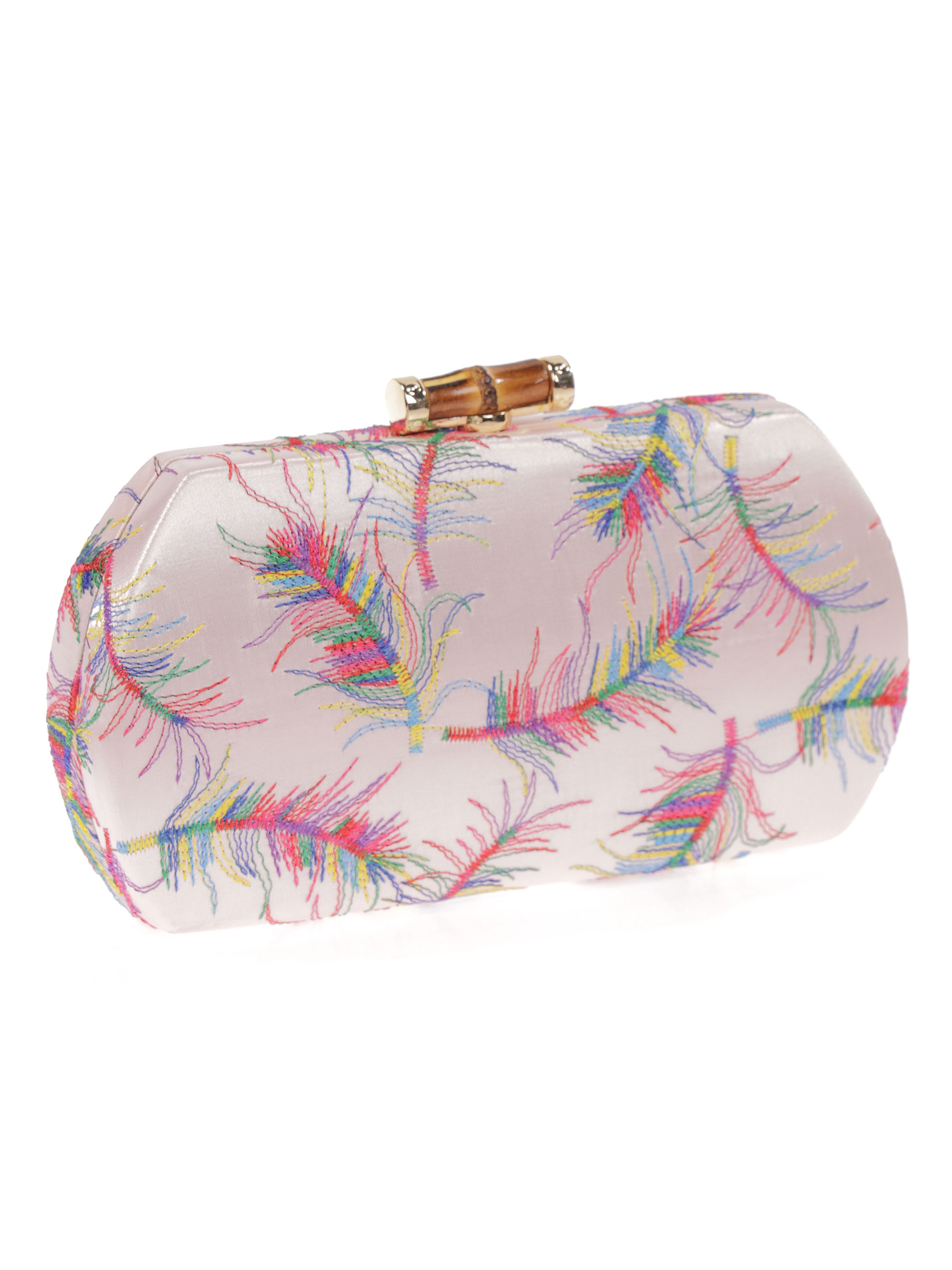 Bolso de fiesta. Material raso. Detalle bordados en ambos lados. Asa de hombro en cadena. Forro sin bolsillo interior. Cierre metálico dorado con efecto bambú.