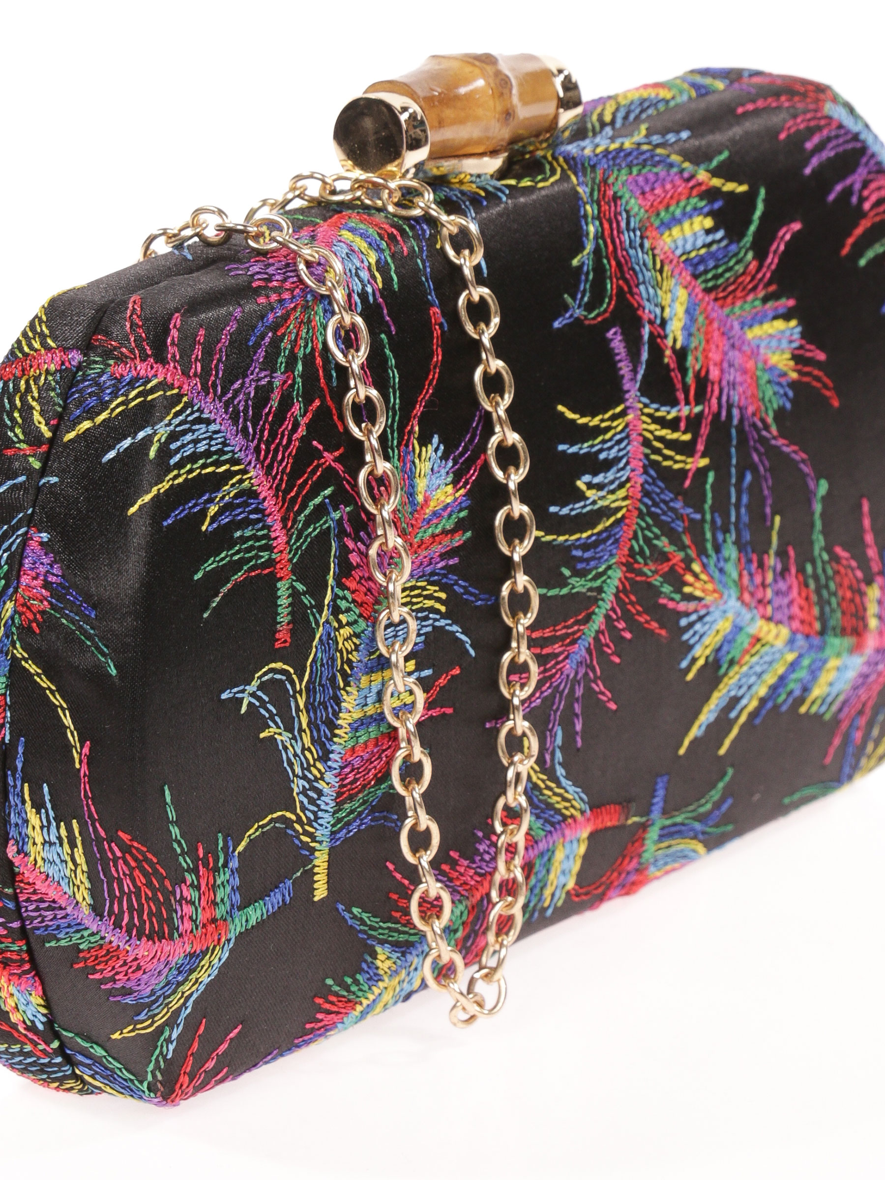 Bolso de fiesta. Material raso. Detalle bordados en ambos lados. Asa de hombro en cadena. Forro sin bolsillo interior. Cierre metálico dorado con efecto bambú.