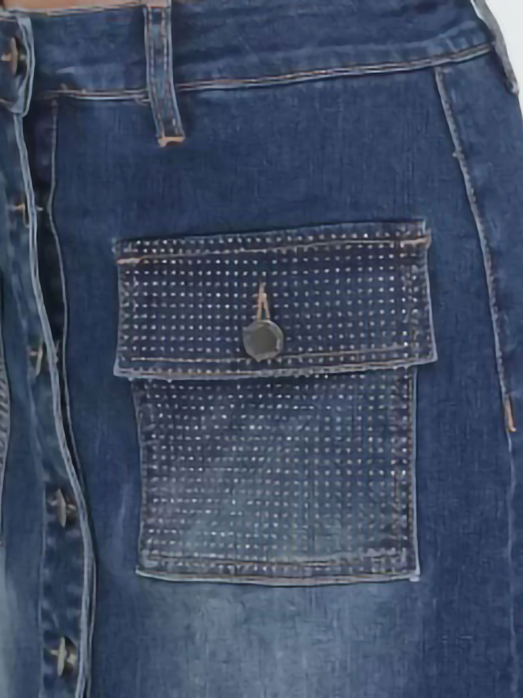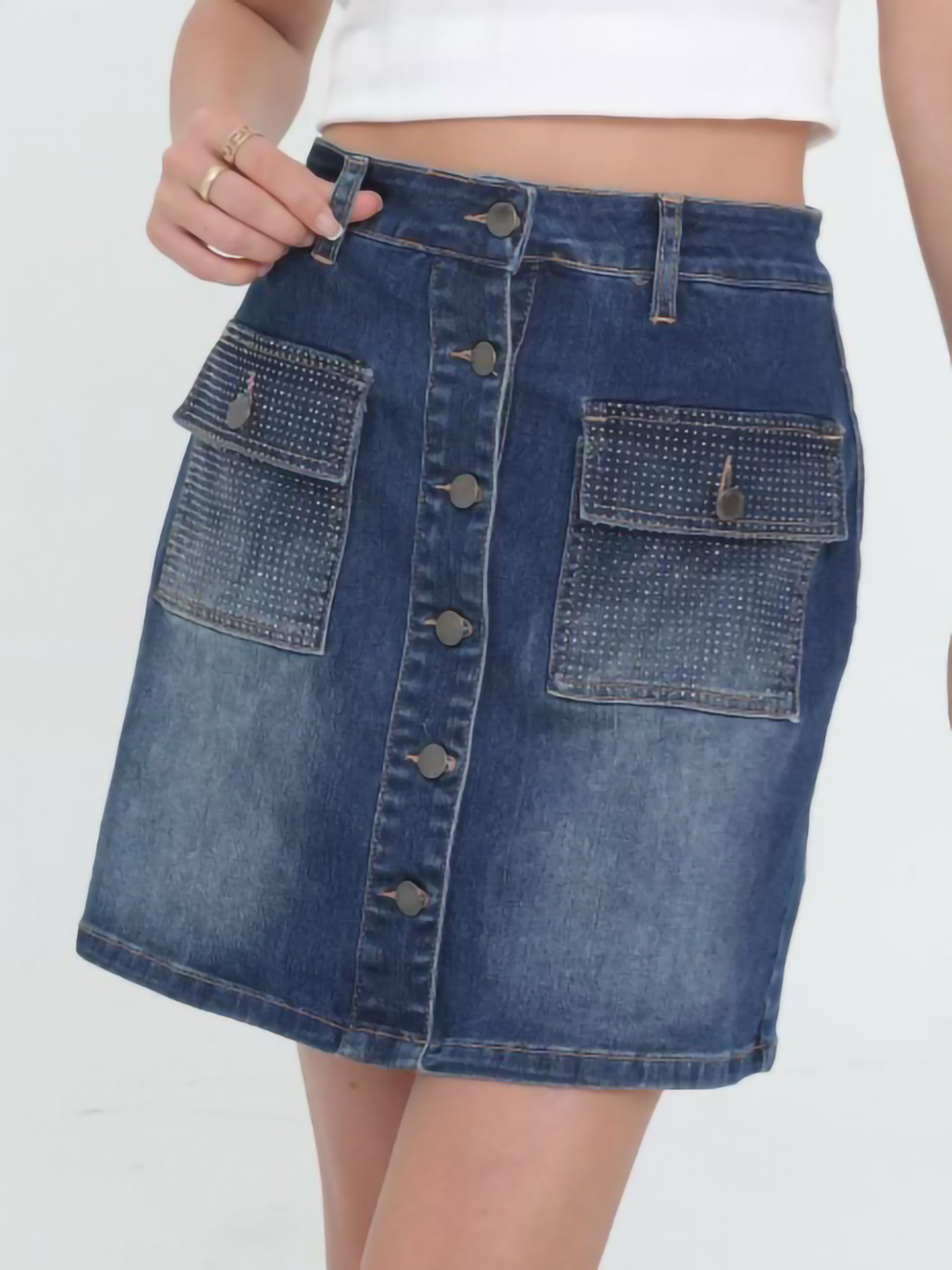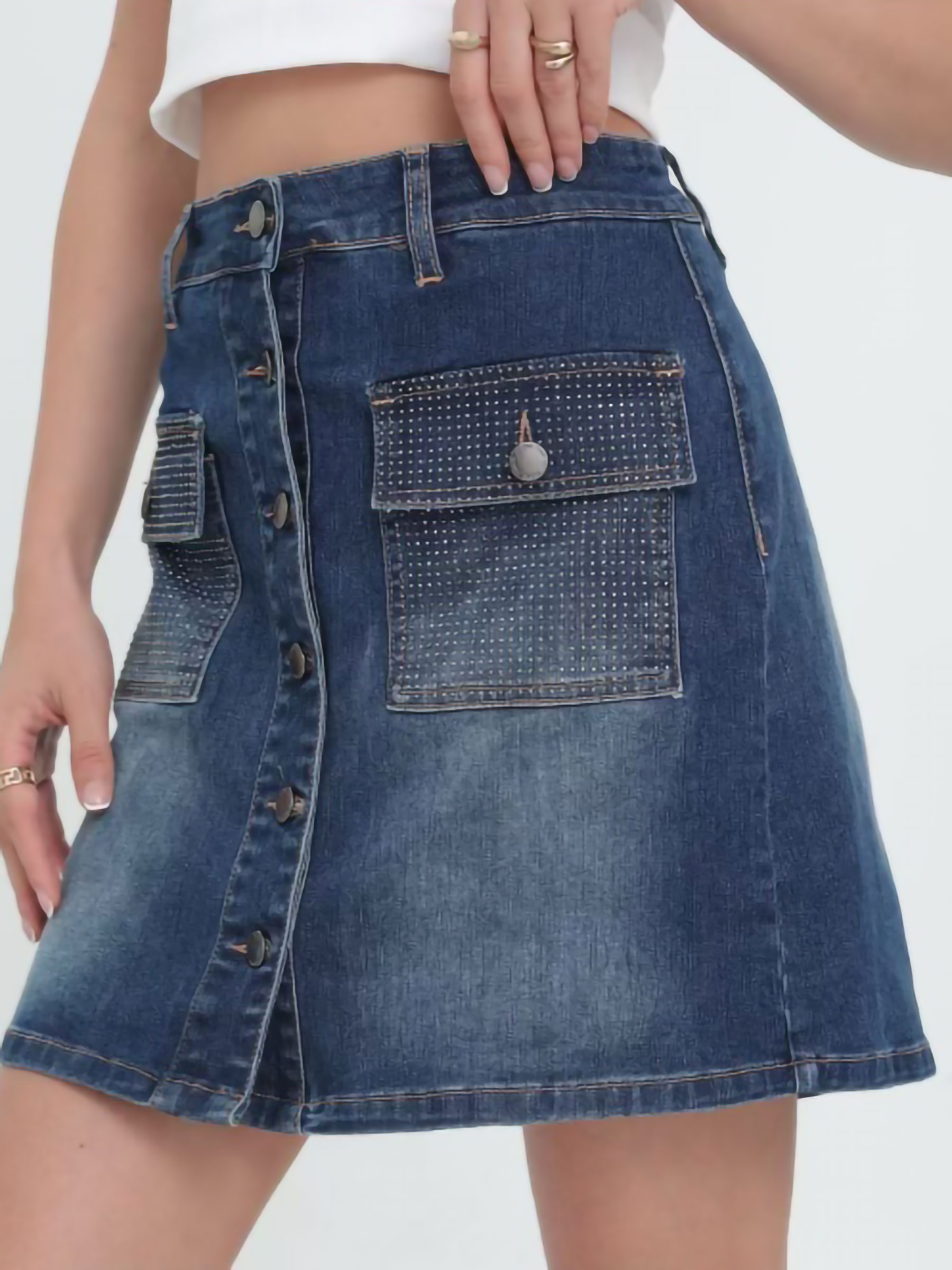 Short denim tipo falda. Bolsillos de plastrón con solapa y detalle strass. Tiro alto. Cierre delantero con cremallera y botón metálico.