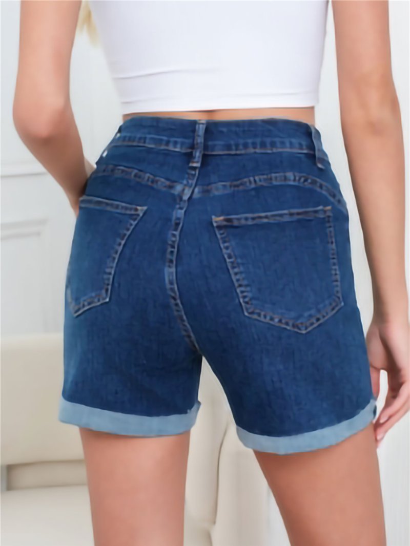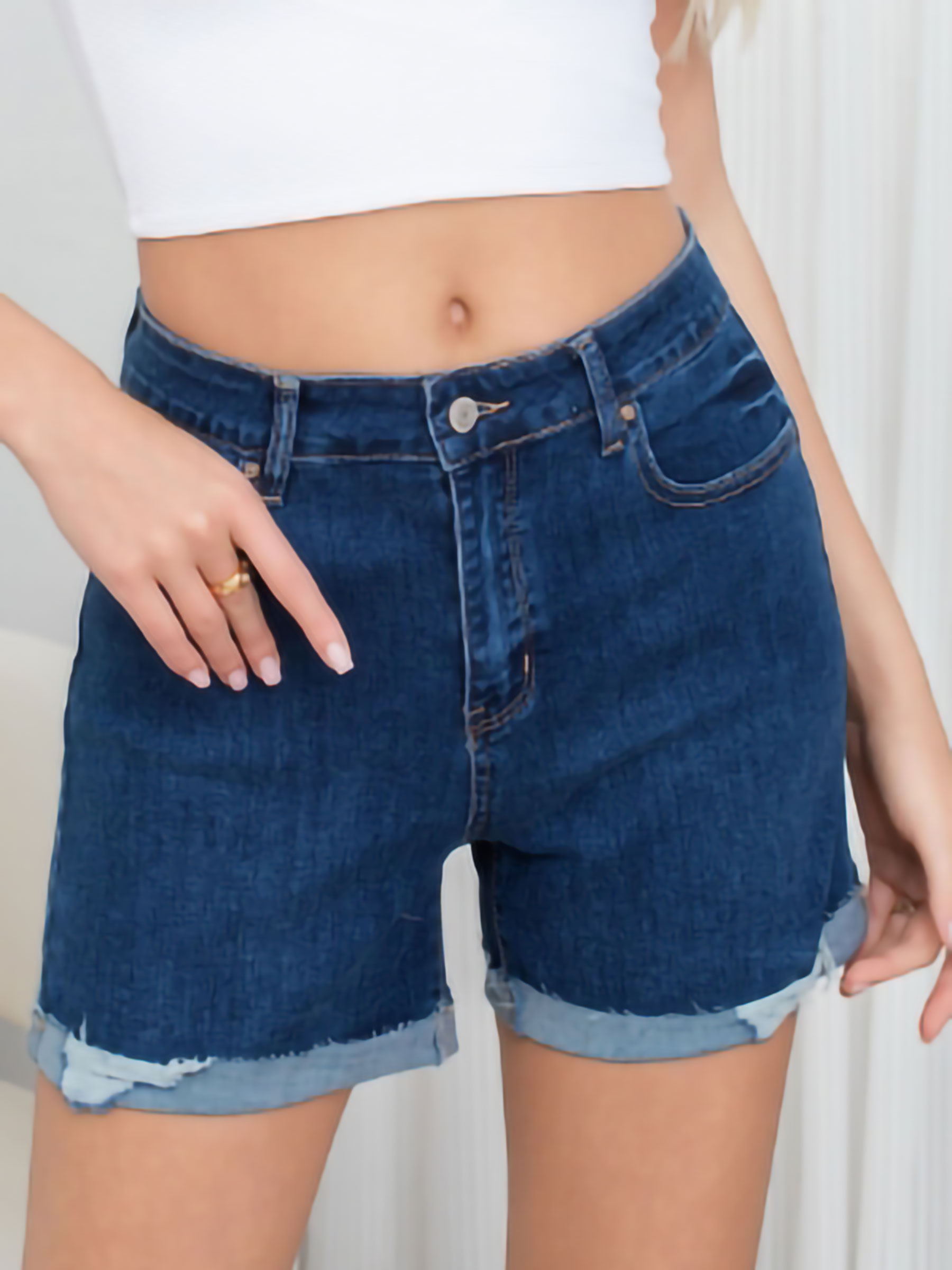 Short denim. Bajo acabado rotos en vueltas. Tiro alto. Cinco bolsillos. Cierre delantero con cremallera y botón metálico.