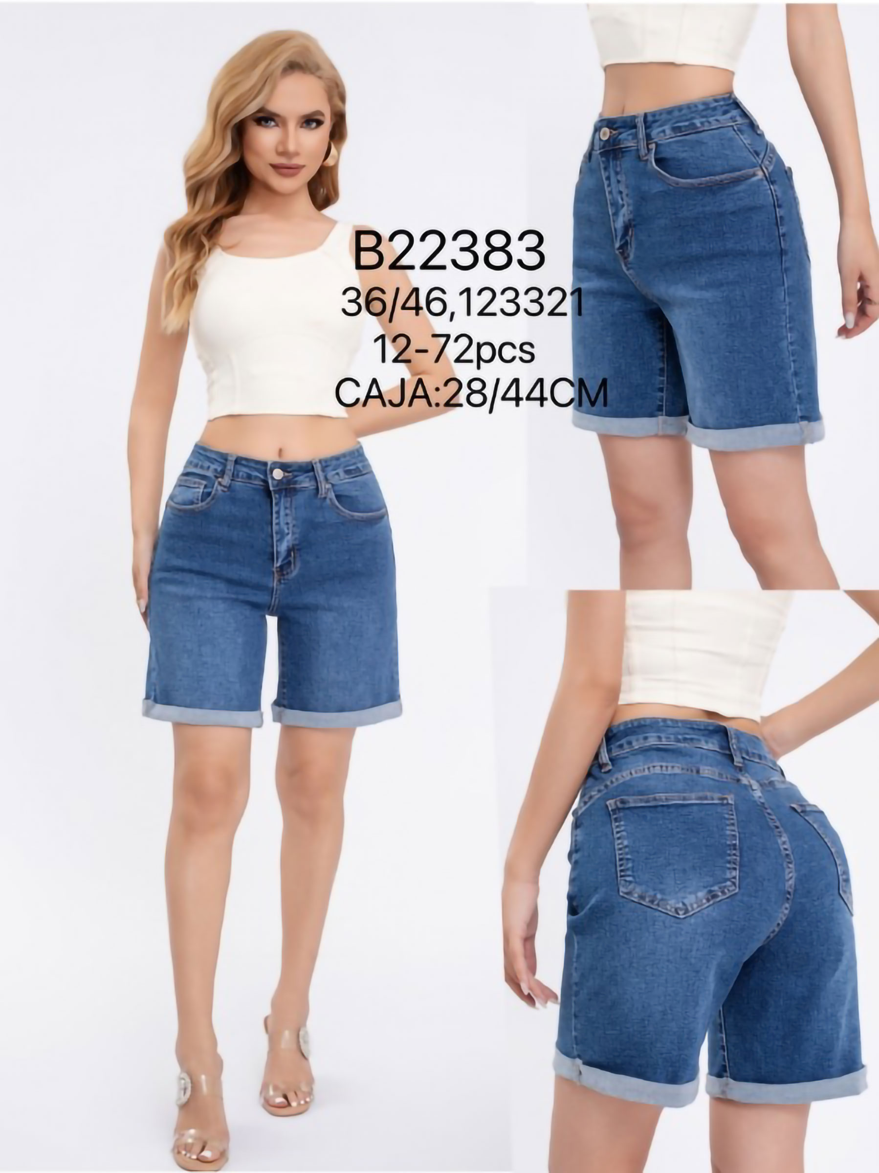 Bermuda denim. Bajo acabado en vuelta. Tiro alto. Cinco bolsillos. Cierre delantero con cremallera y botón metálico.