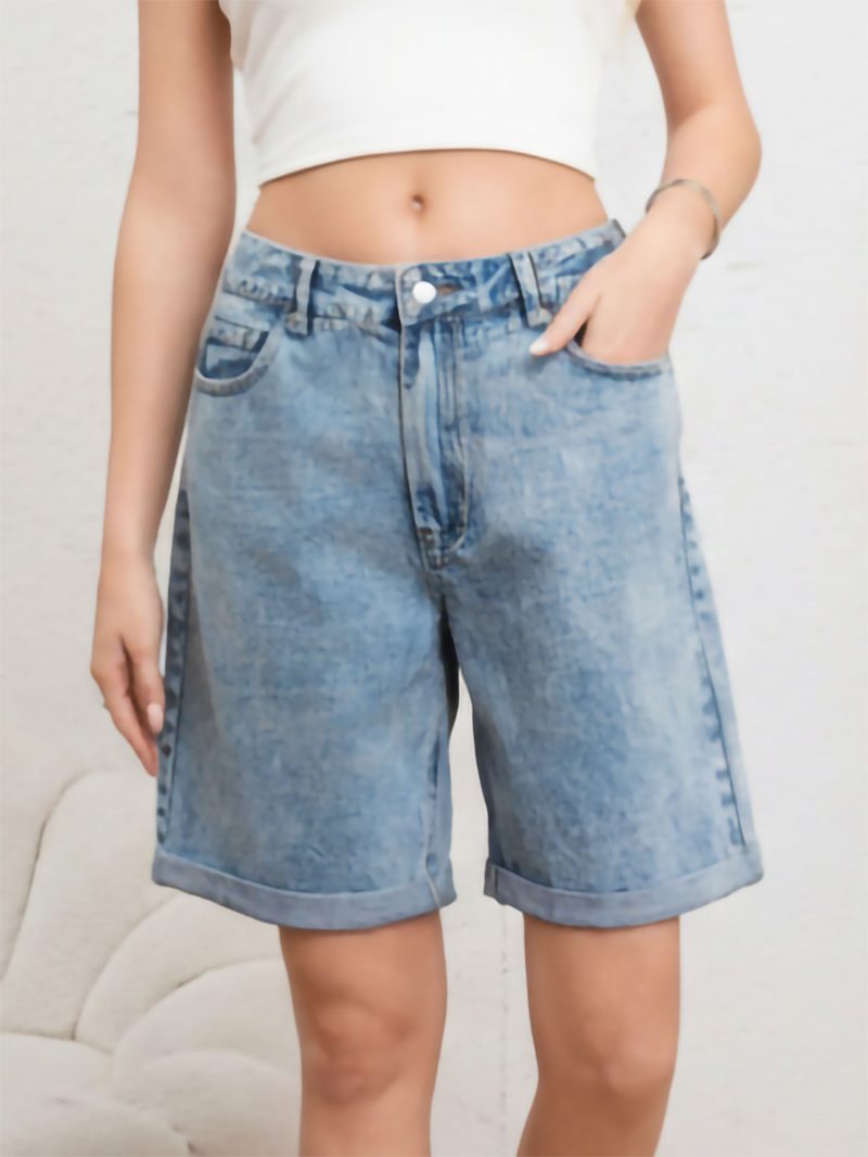 Bermuda denim. Bajo acabado en vuelta. Tiro alto. Cinco bolsillos. Cierre delantero con cremallera y botón metálico.