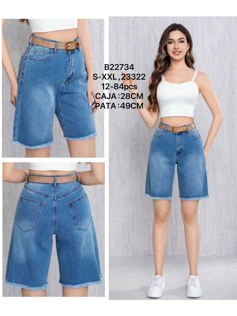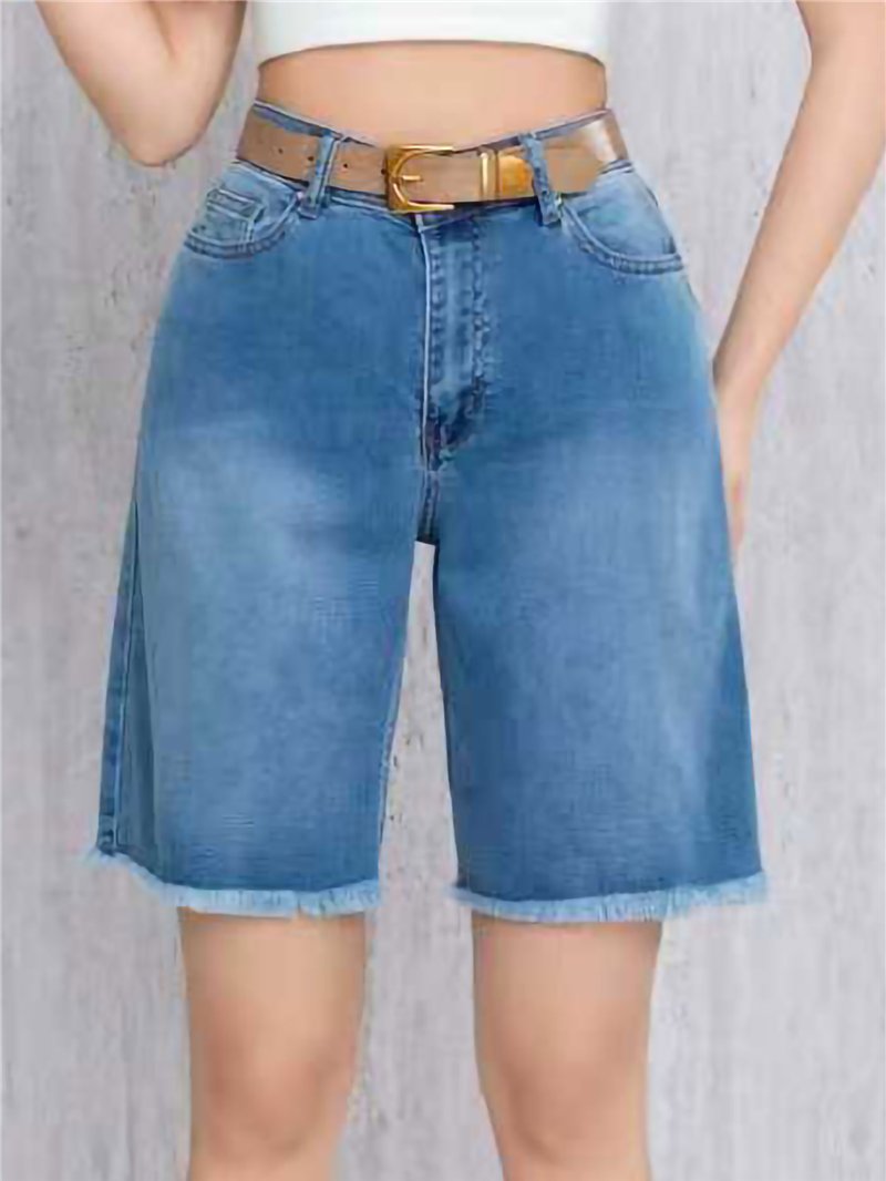 Bermuda vaquera ancha. Cinturón incluido. Tiro alto. Cinco bolsillos. Cierre frontal con cremallera y botón metálico. Bajo desflecado. Tiro 27 cm. Bajo 49 cm.
