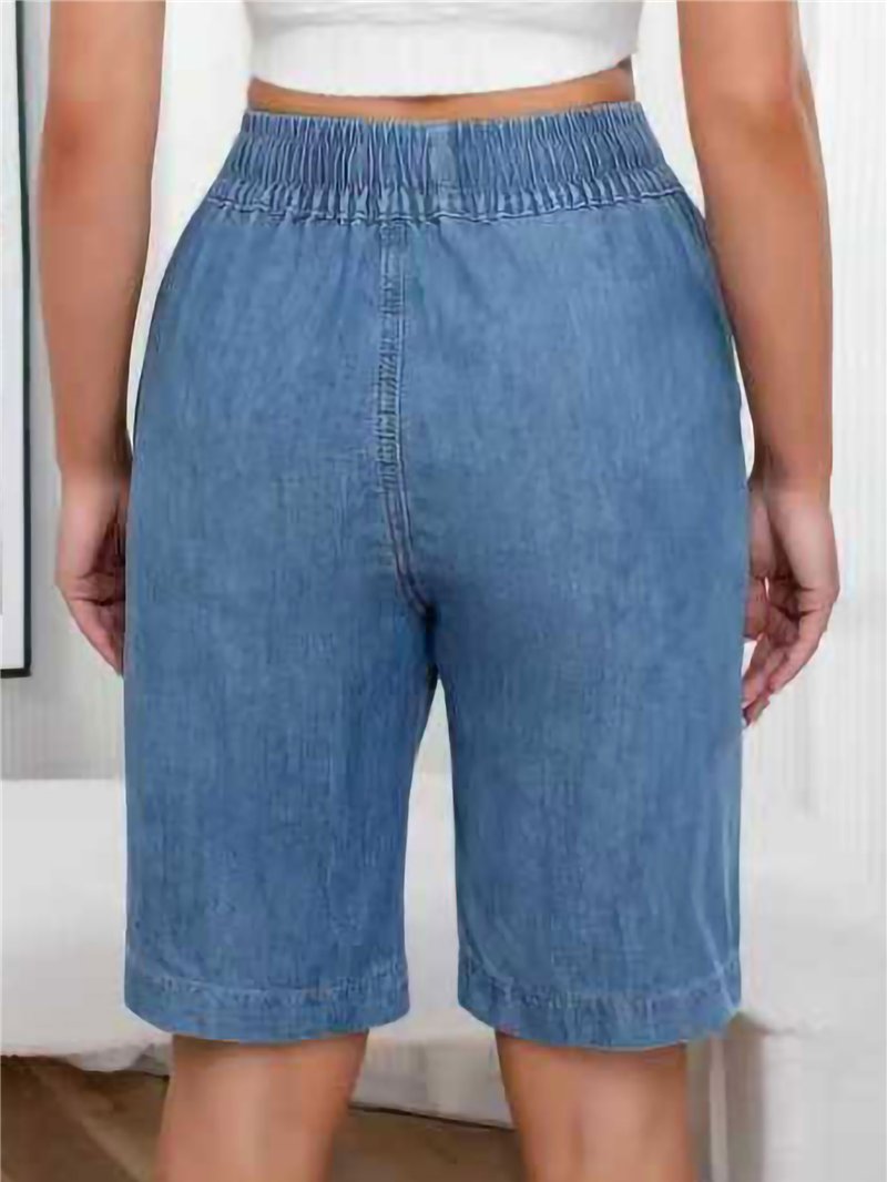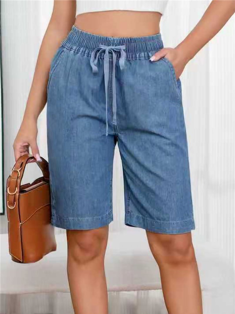 Bermuda vaquera. Cintura elástica. Cordón ajustable. Bolsillos laterales. Pierna recta. Tejido denim no elástico. Tiro 32 cm. Largo 56 cm. Bajo 26 cm.