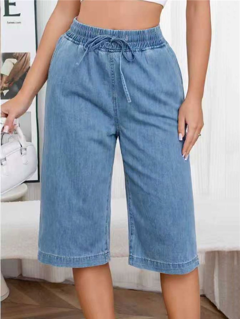 Pantalón culotte vaquero. Cintura elástica. Cordón ajustable. Bolsillos laterales. Pierna ancha. Tejido denim no elástico. Tiro 32 cm. Largo 68 cm. Bajo 28 cm.
