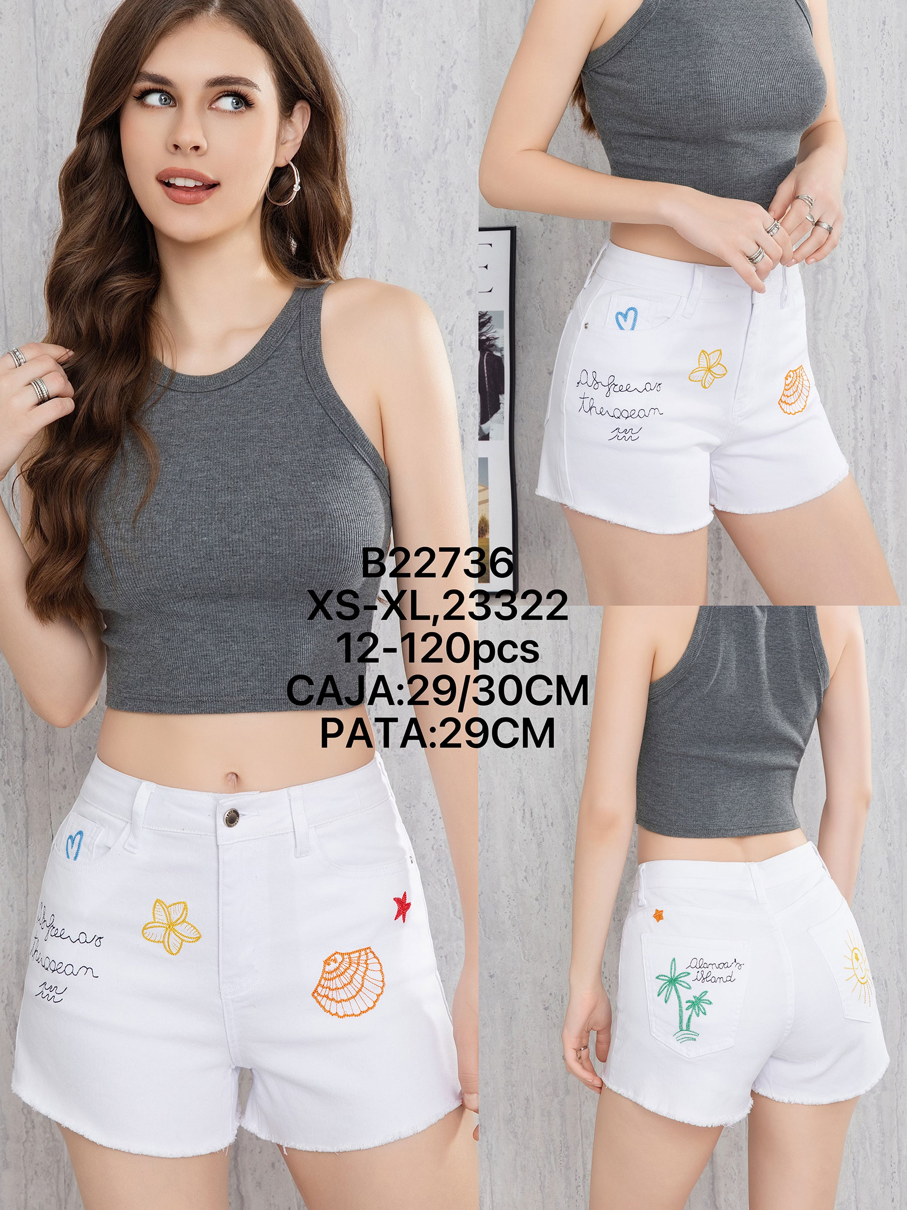 Shorts denim blancos. Bordados marineros multicolor. Tiro 29 cm. Largo 30 cm. Bajo 29 cm. Cinco bolsillos. Bajo desflecado. Cierre frontal con cremallera y botón metálico.