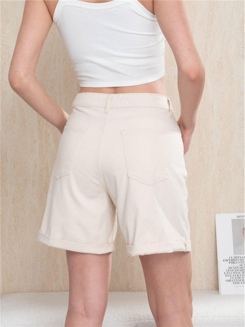 Bermuda vaquera. Color beige. Cinco bolsillos. Dobladillo vuelto. Cierre frontal con cremallera y botón metálico. Tiro 28 cm. Largo 43 cm.
