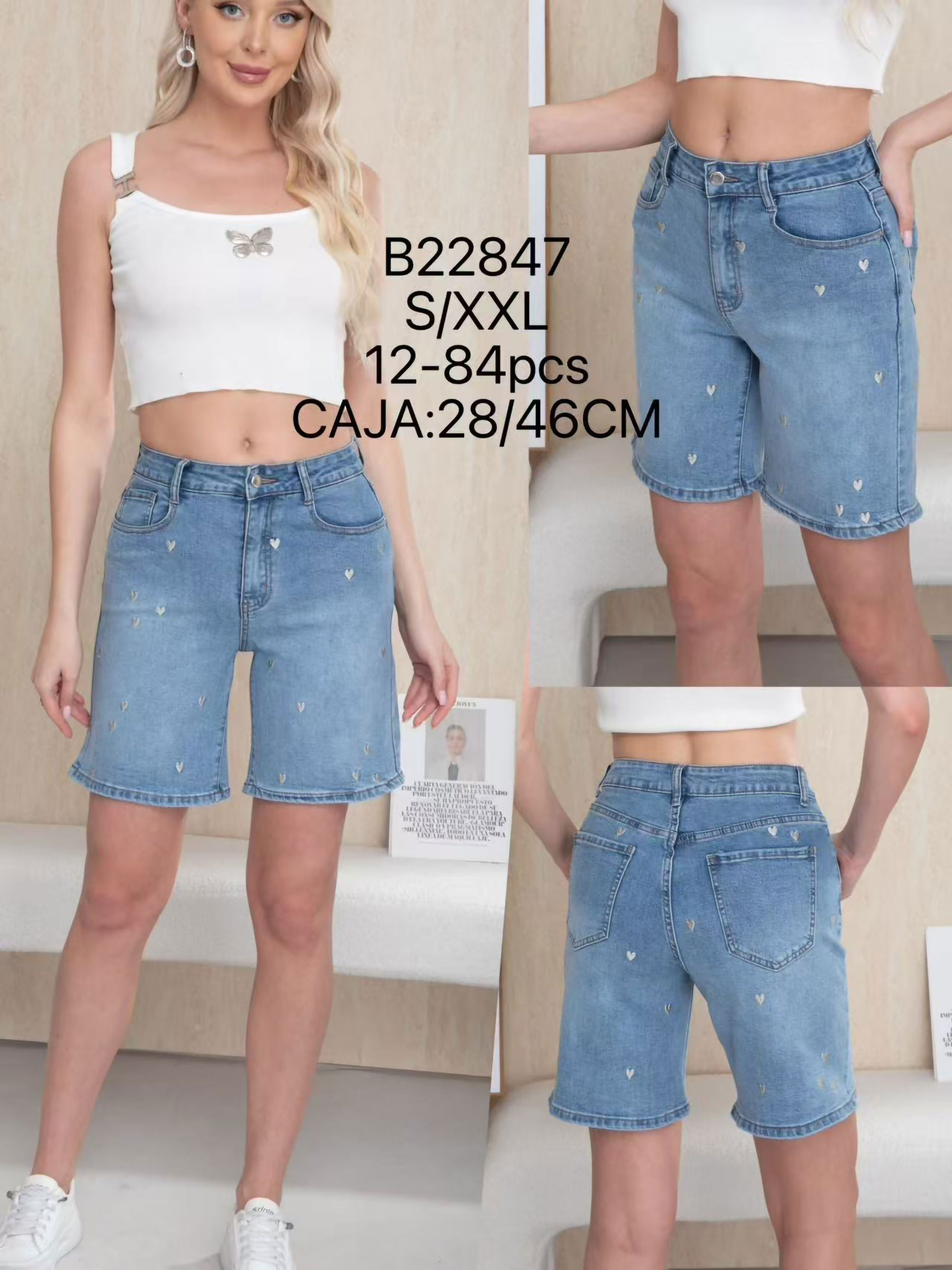 Bermuda vaquera. Tiro alto. Bordado de corazones. Bajo recto. Cinco bolsillos. Cierre frontal con cremallera y botón metálico. Tiro 28 cm. Largo 46 cm.