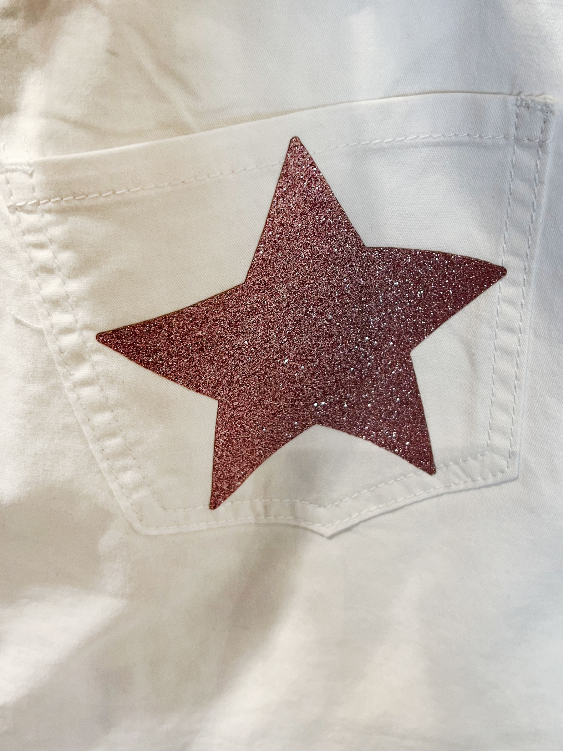 Short falda vaquera. Detalle estrella glitter en bolsillos traseros. Bajo desflecado. Cinco bolsillos. Cierre frontal con cremallera y botón metálico. Largo 37 cm.
