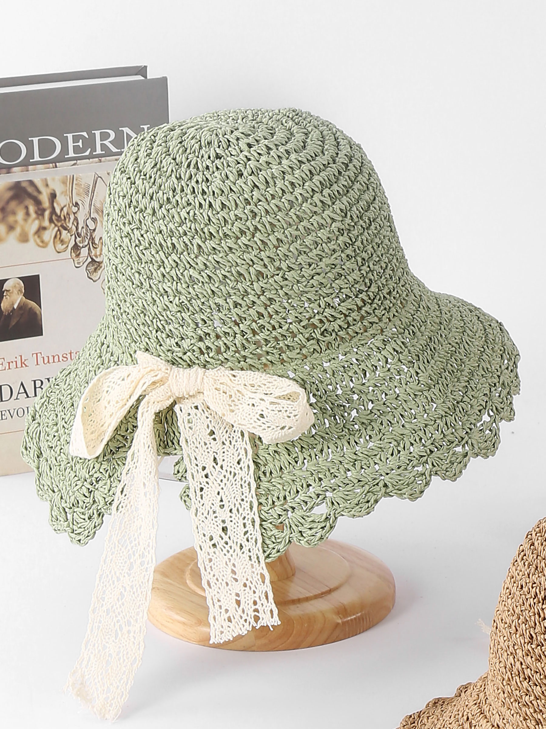Sombrero de rafia crochet con lazo de encaje
