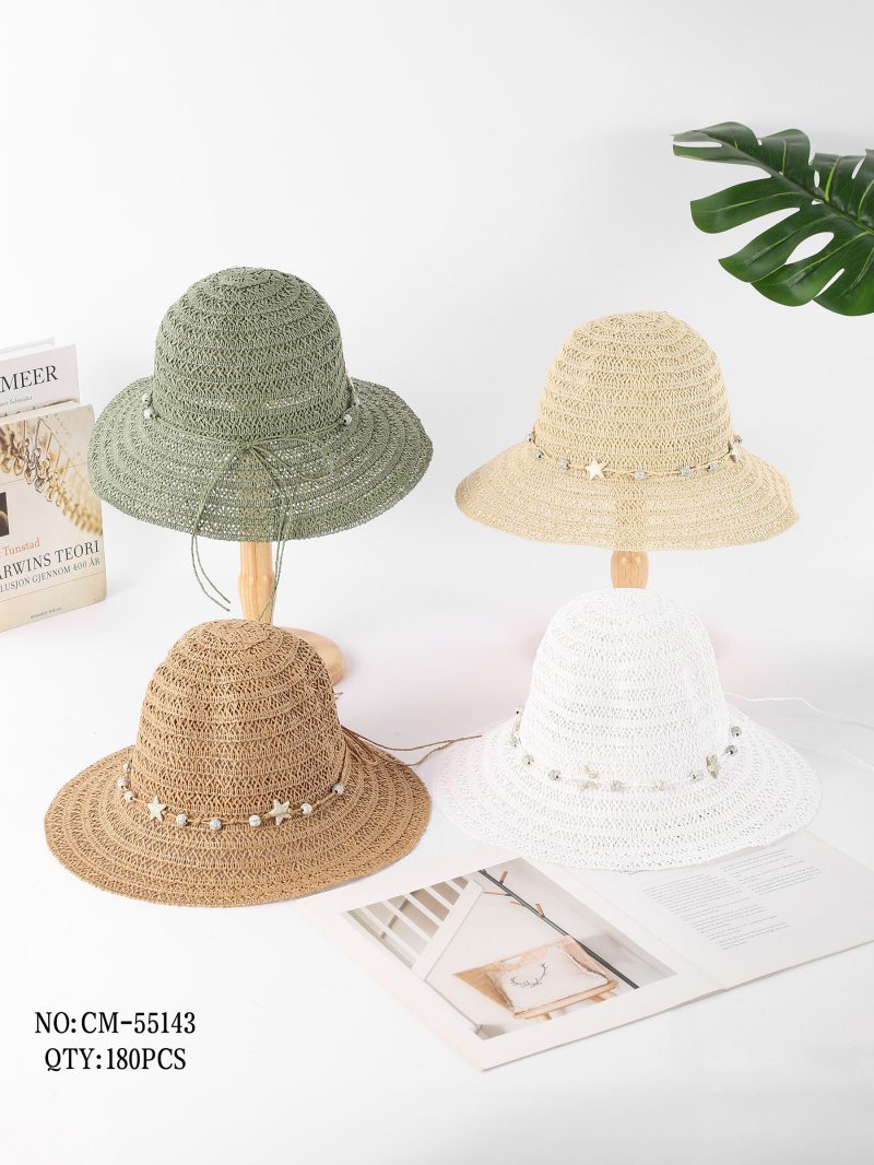 Sombrero de rafia calado con cordón y abalorios de estrellas
