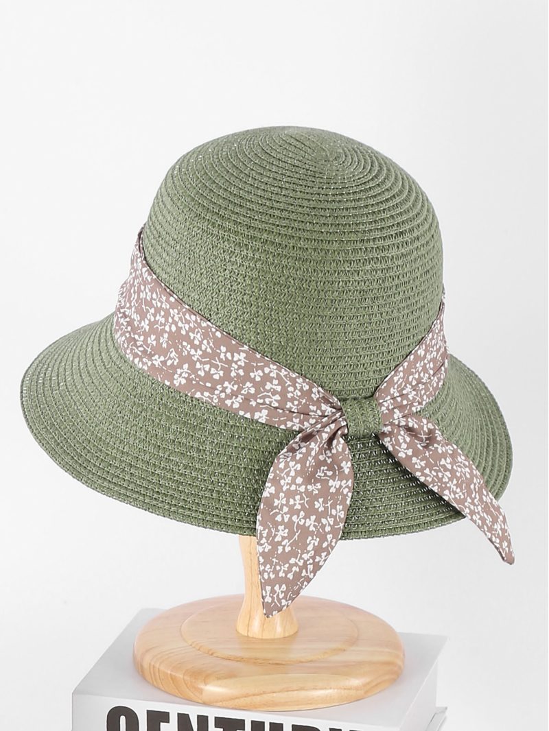 Sombrero de rafia tipo cloche con cinta estampada de flores y lazo
