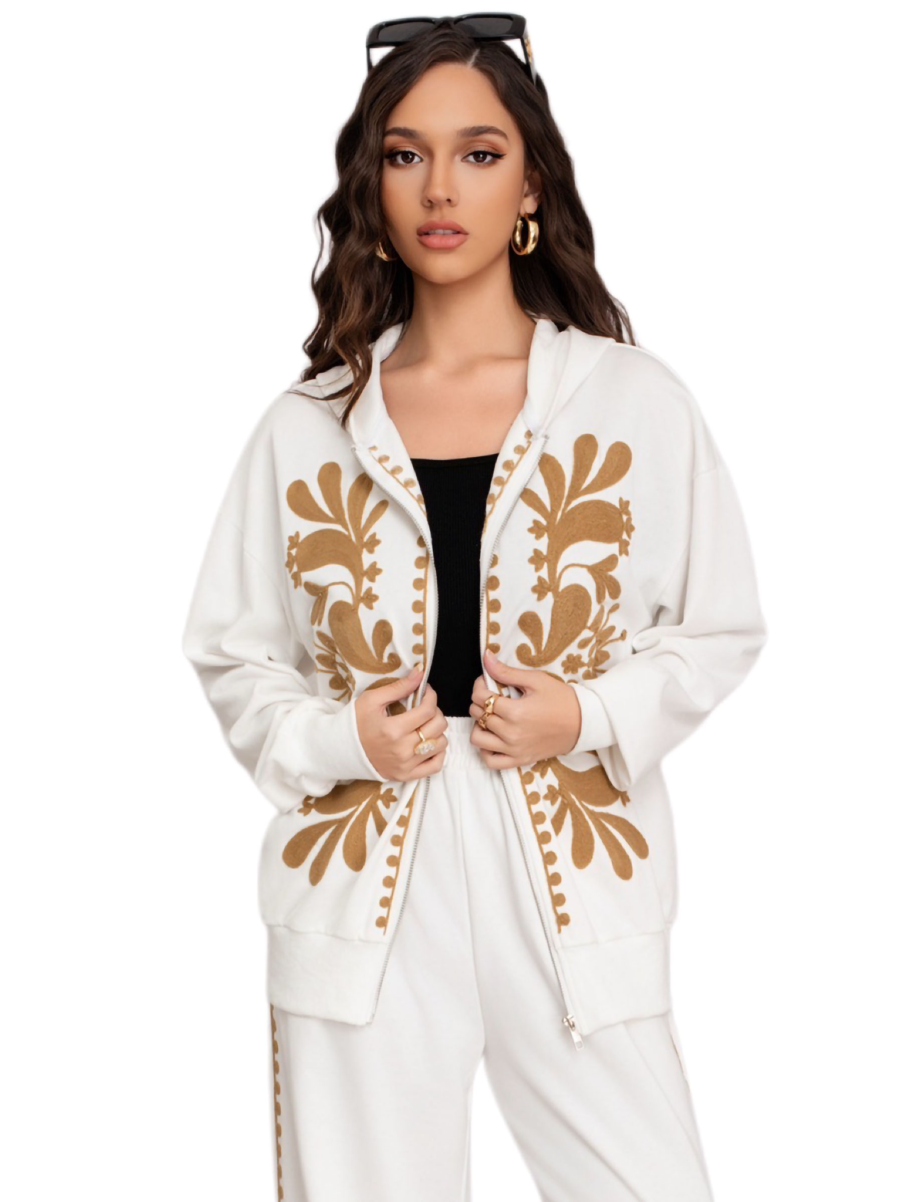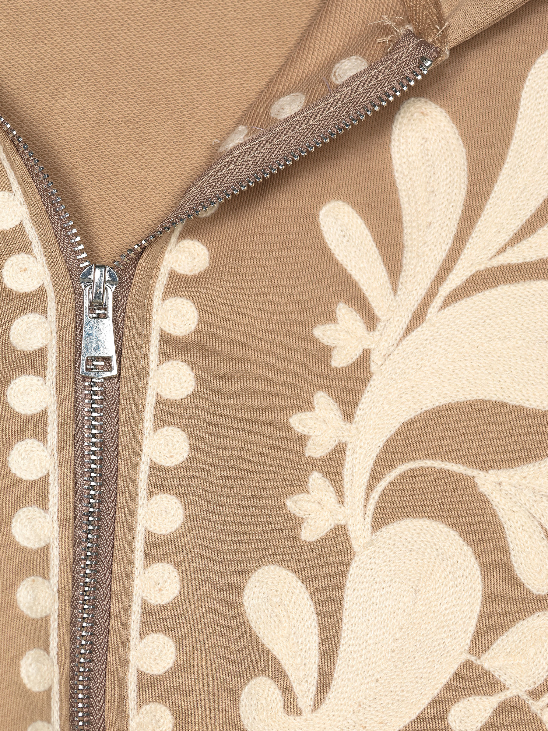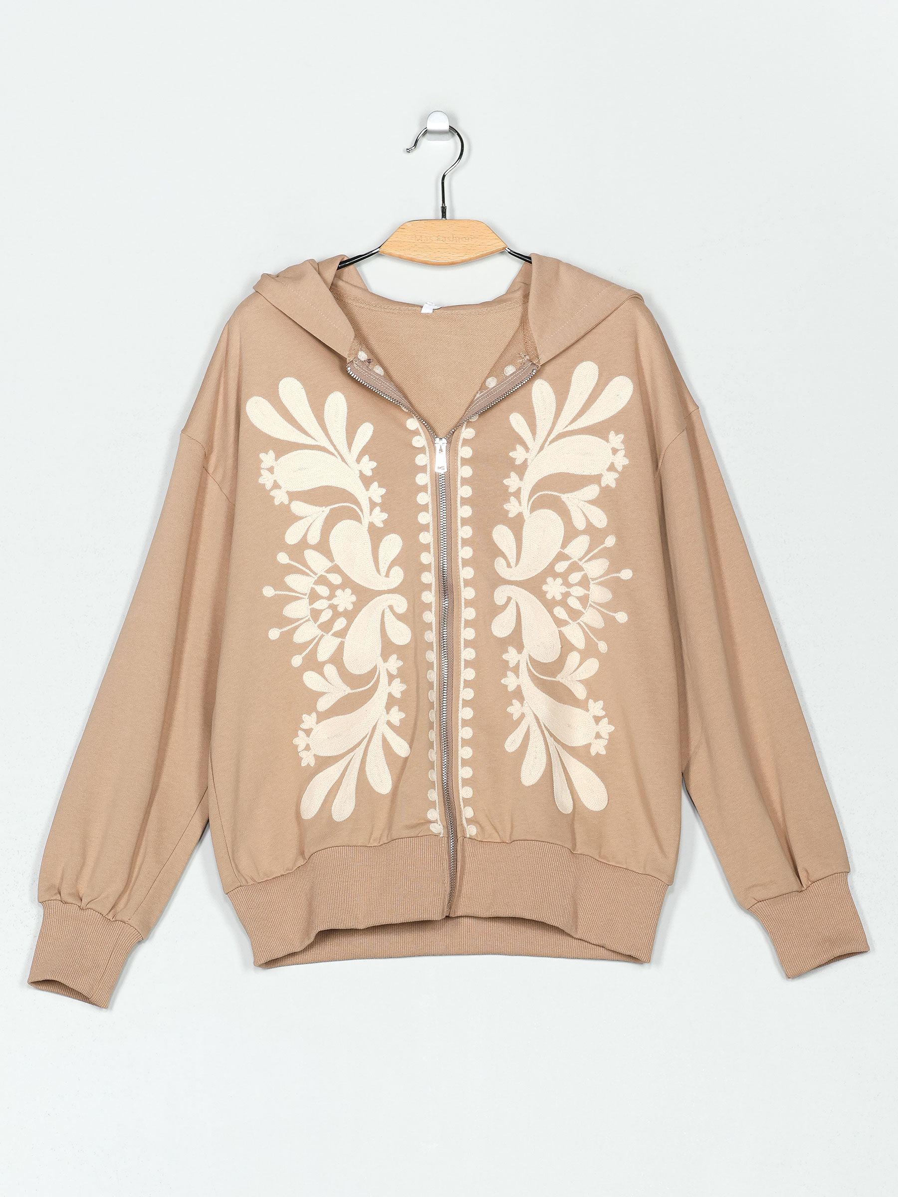 Sudadera bordada floral con capucha. Manga larga. Cierre delantero con cremallera.