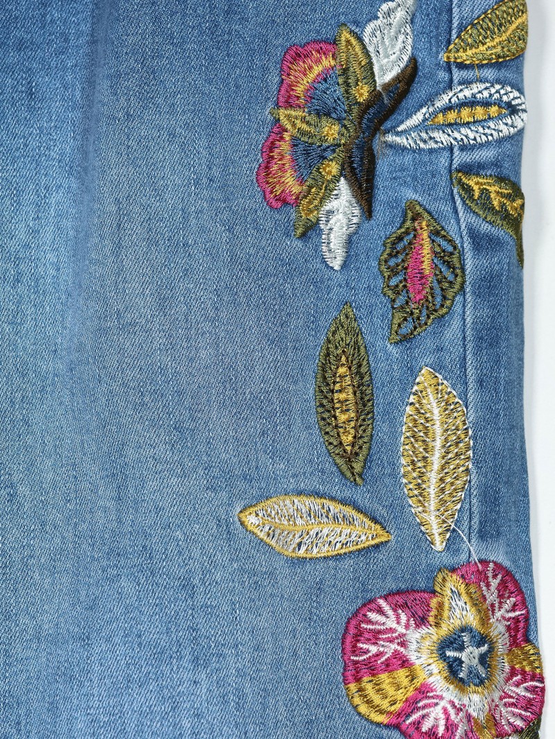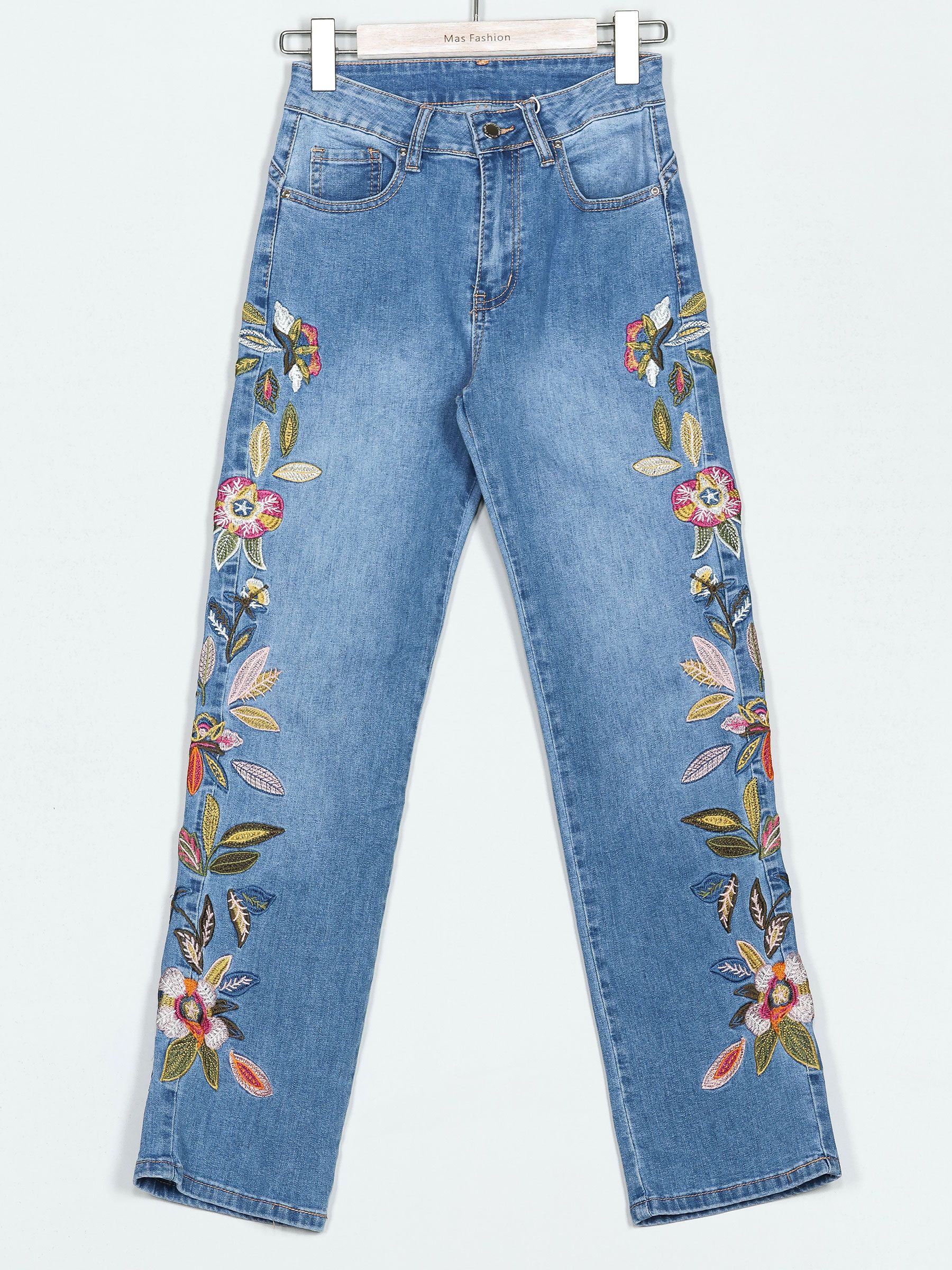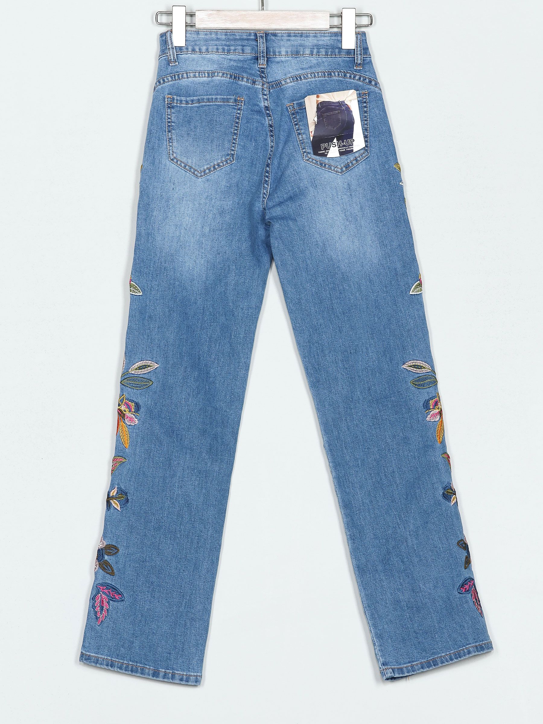 Jeans bordados. Push up. Tiro alto. Cinco bolsillos. Cierre frontal con cremallera y botón metálico.