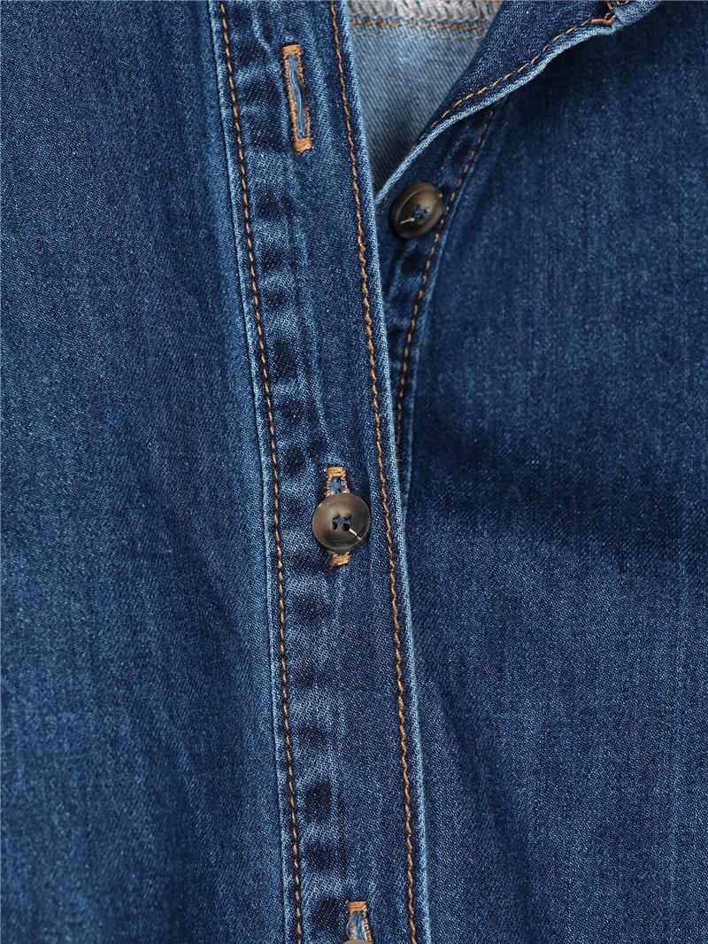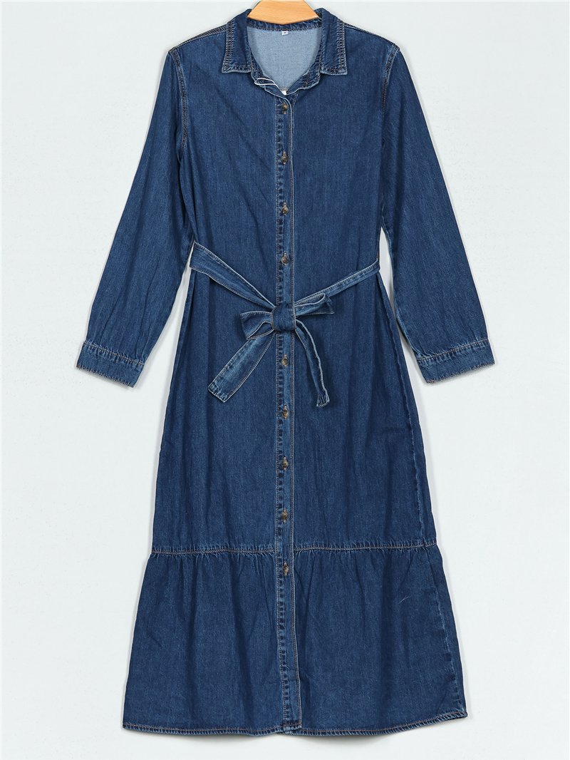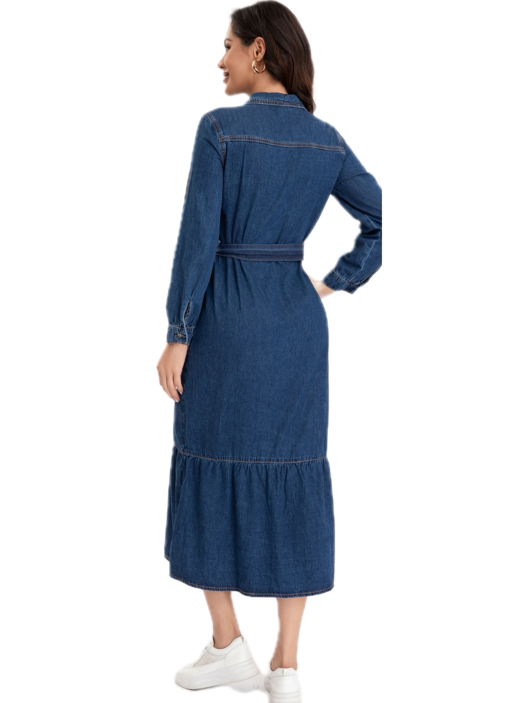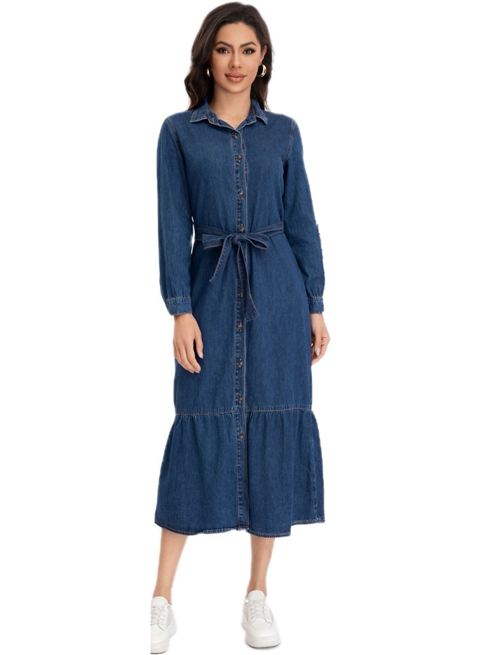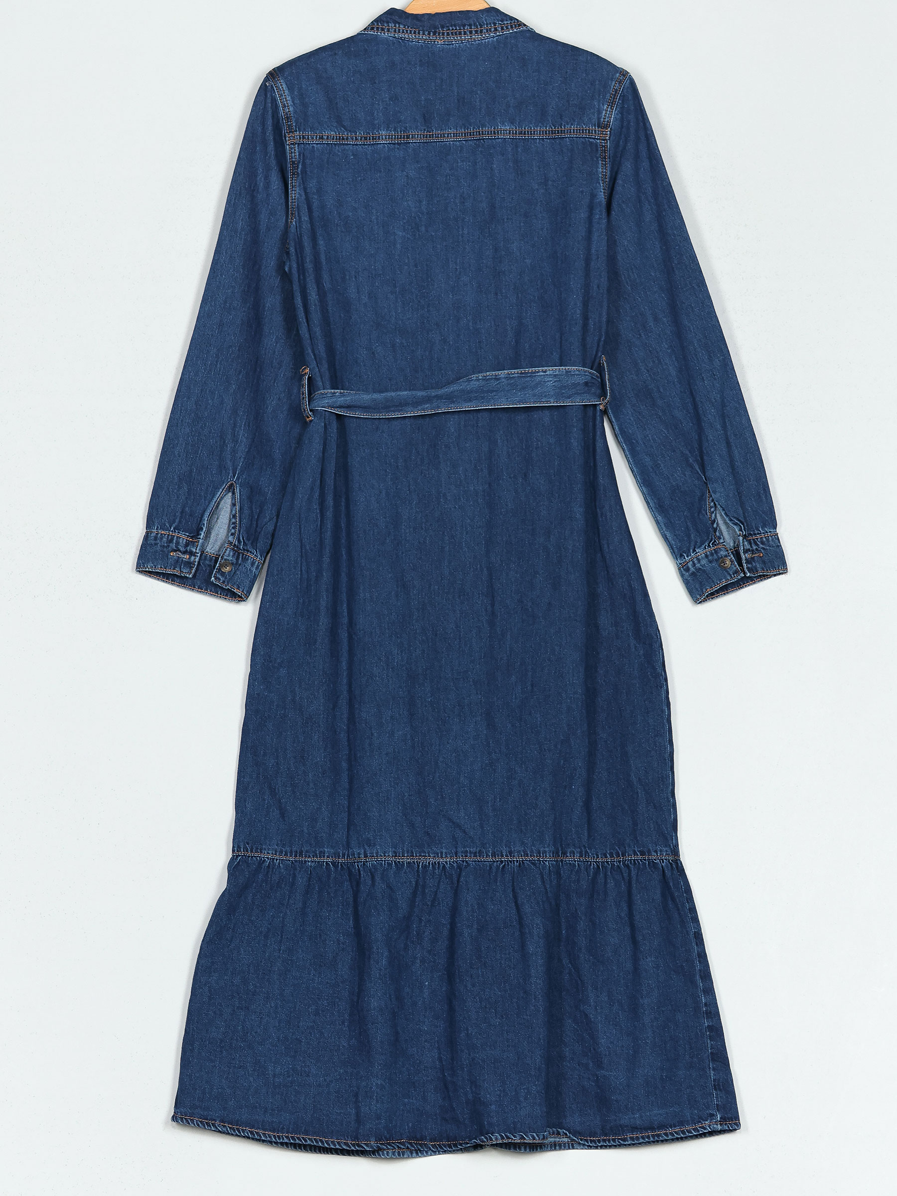 Vestido largo denim con cinturón del mismo tejido. Tejido no elástico. Cuello solapa. Manga larga. Cierre frontal con botones.