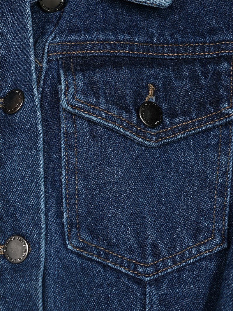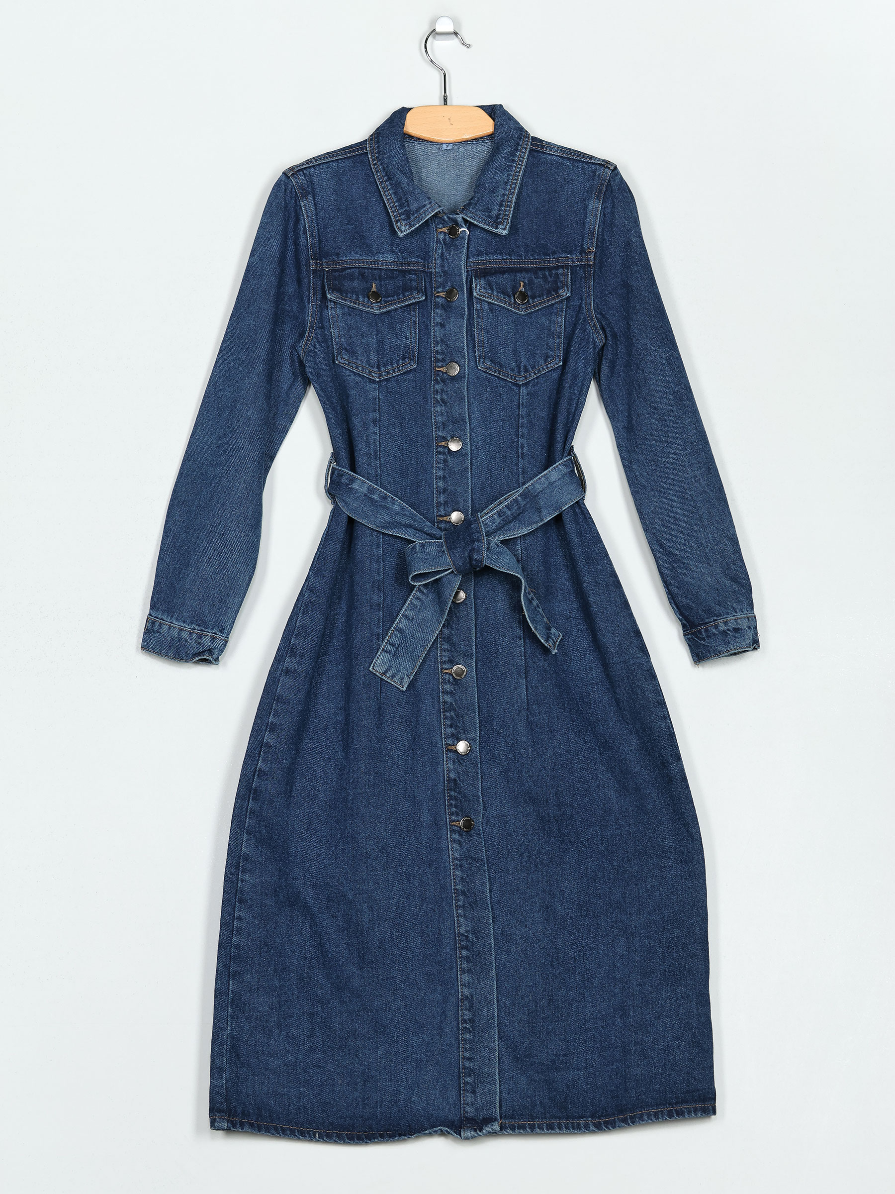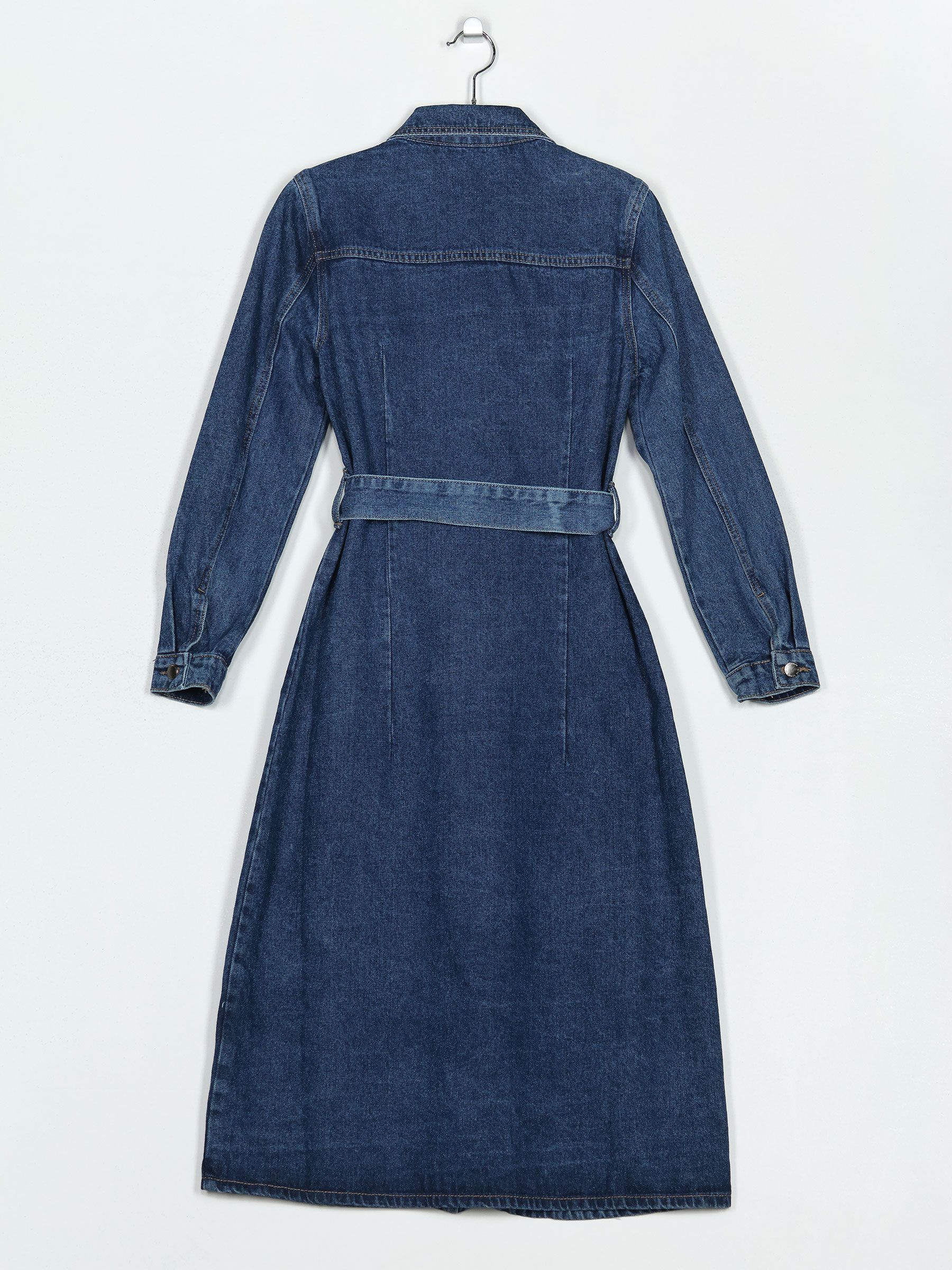 Vestido denim con cinturón del mismo tejido. Tejido no elástico. Dos bolsillos de parche en el pecho. Cuello solapa. Manga larga. Cierre mediante botones.