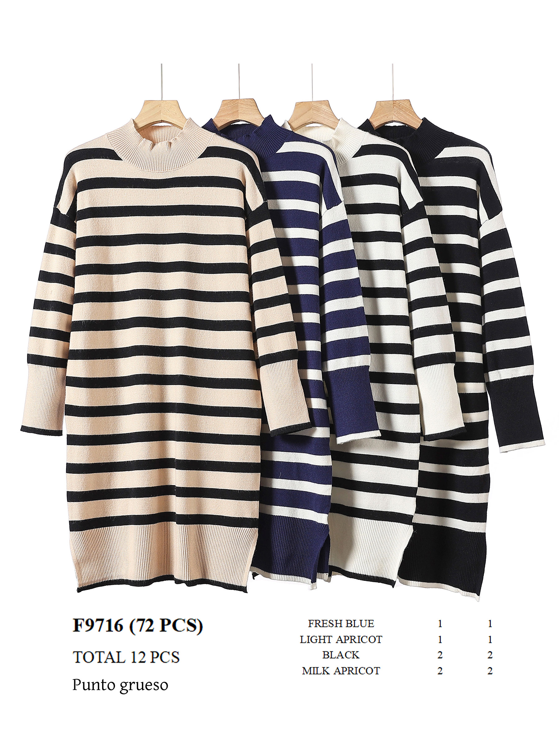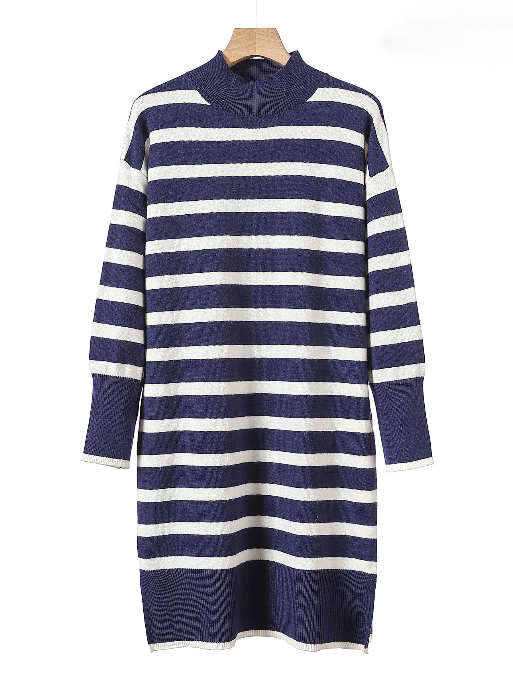 Detalles de vestido amplio franjas punto grueso aberturas cuello perkins DB-F9716