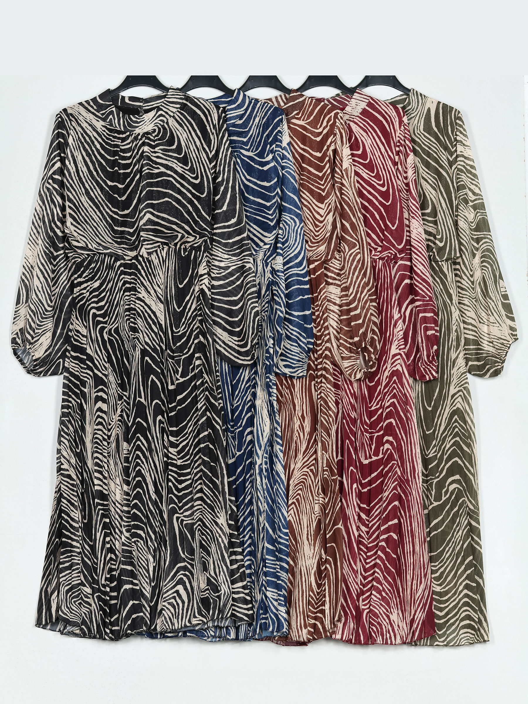Vestido largo estampado de gasa. Frunce cintura. Forro interior. Cuello redondo. Cierre en lágrima con botón en espalda. Manga larga engomada.