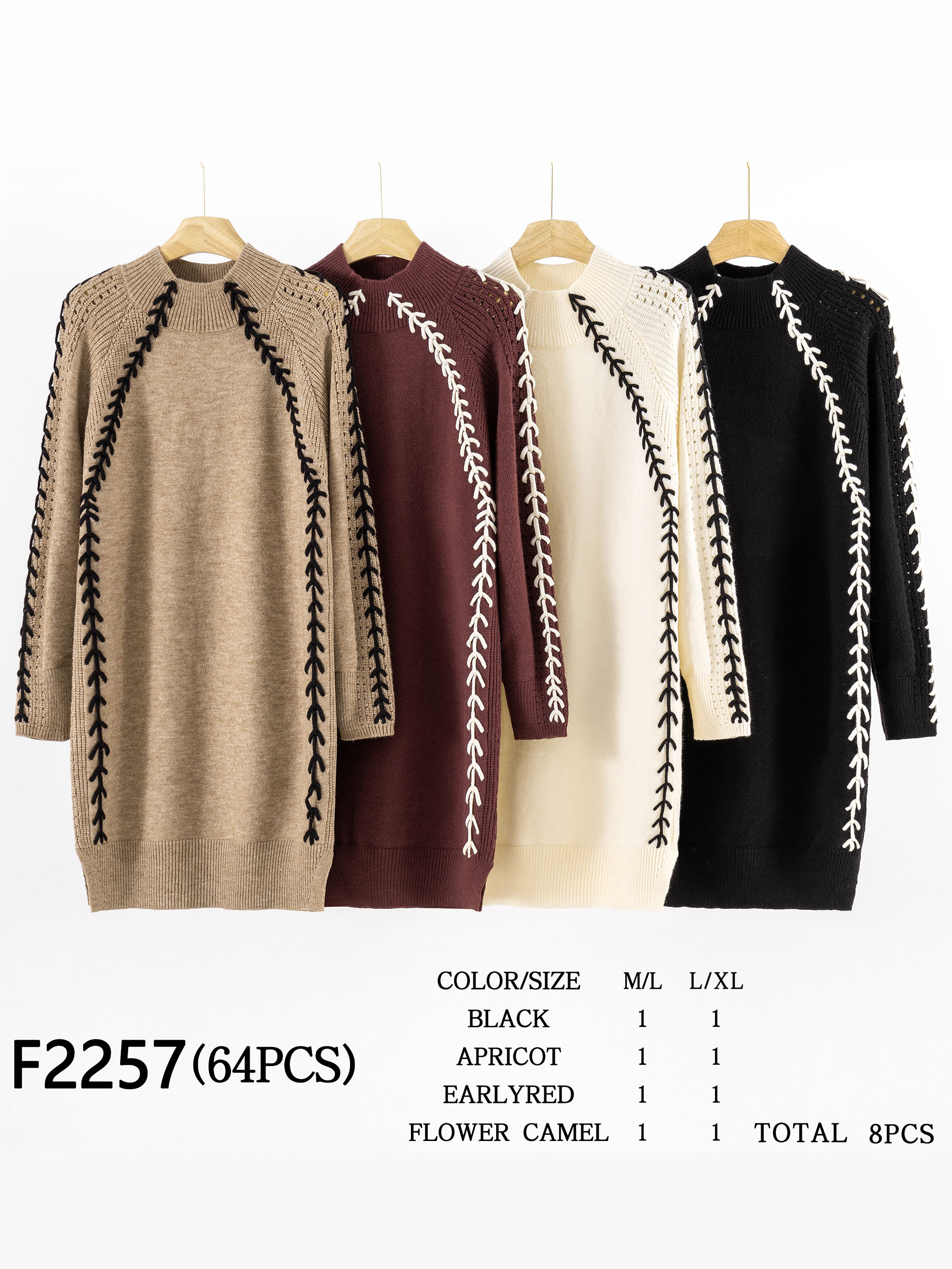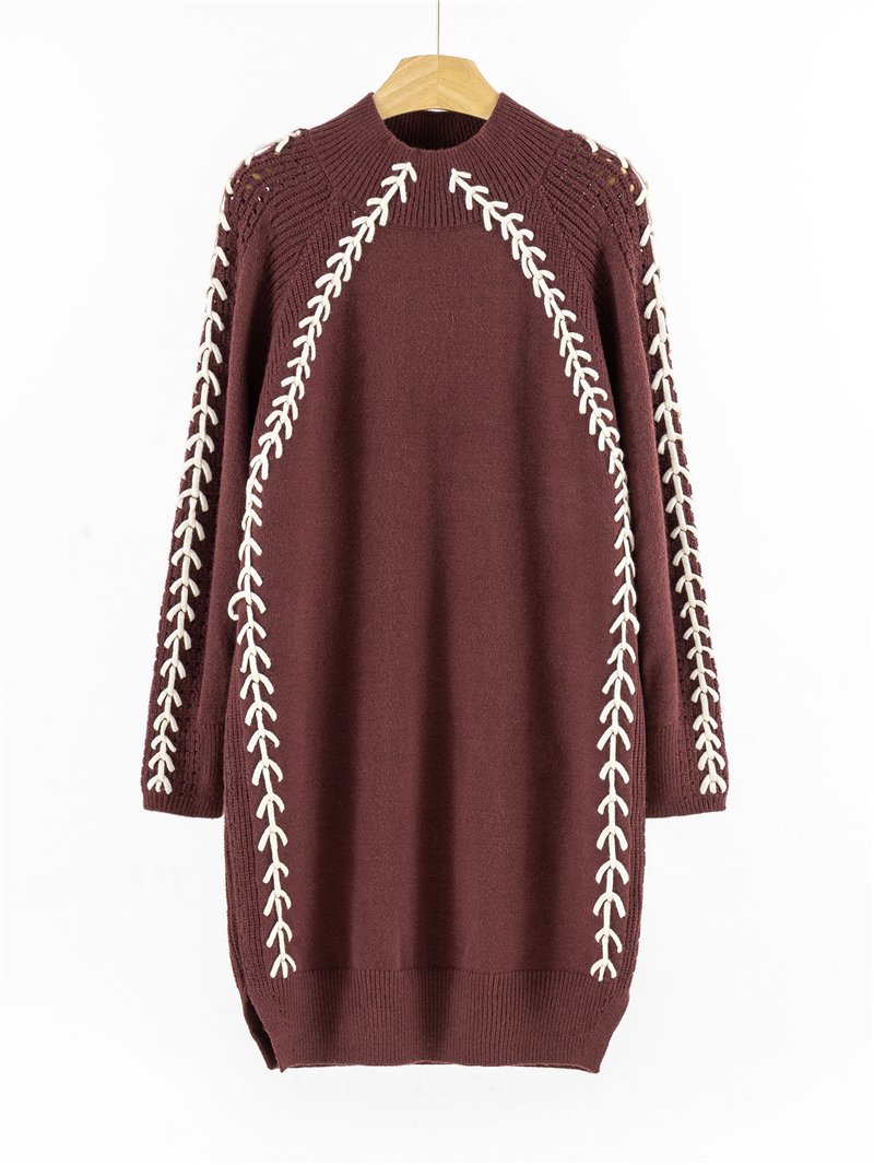 Vestido suéter de punto con largo por encima de la rodilla y bordados de contraste en mangas y cuerpo.