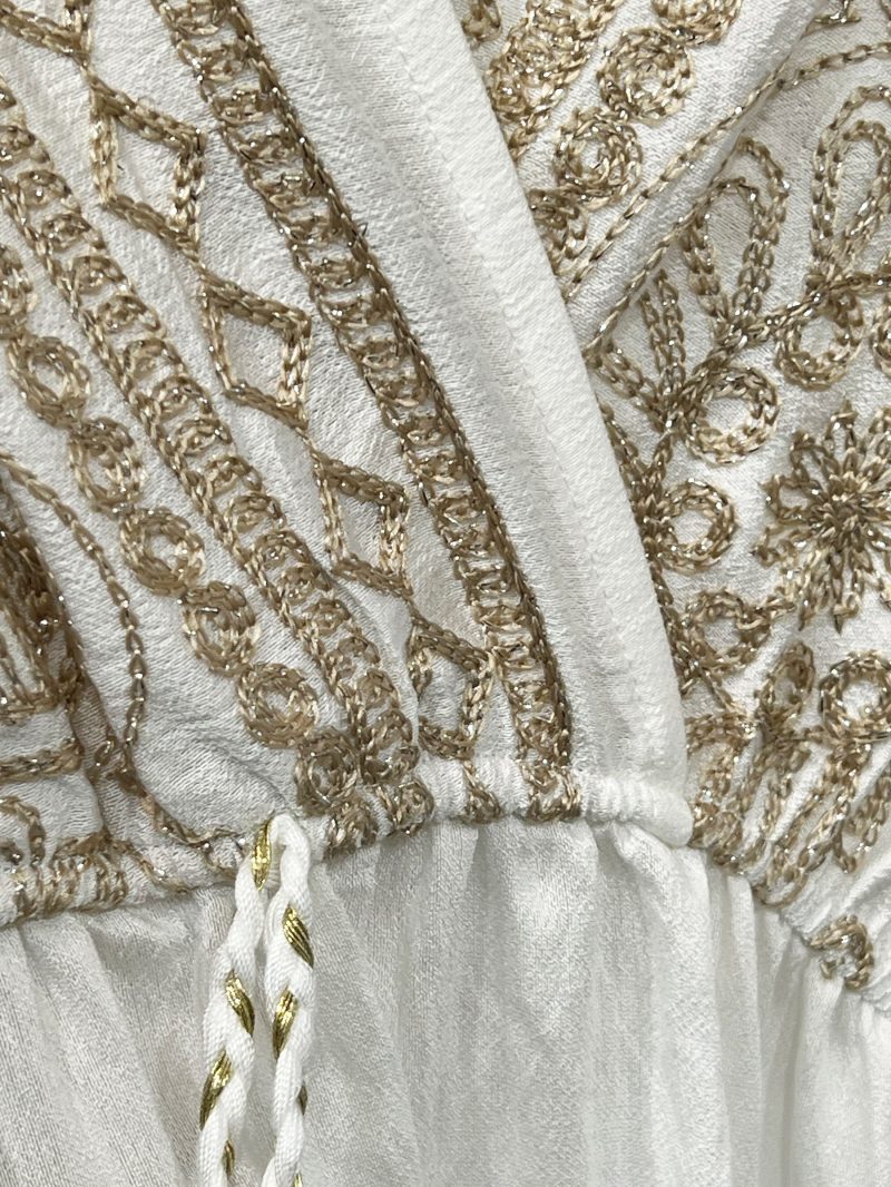 Vestido largo estampado. Escote pico cruzado. Cintura fruncida. Cordón con borlas. Manga corta amplia. Bajo con cenefa.