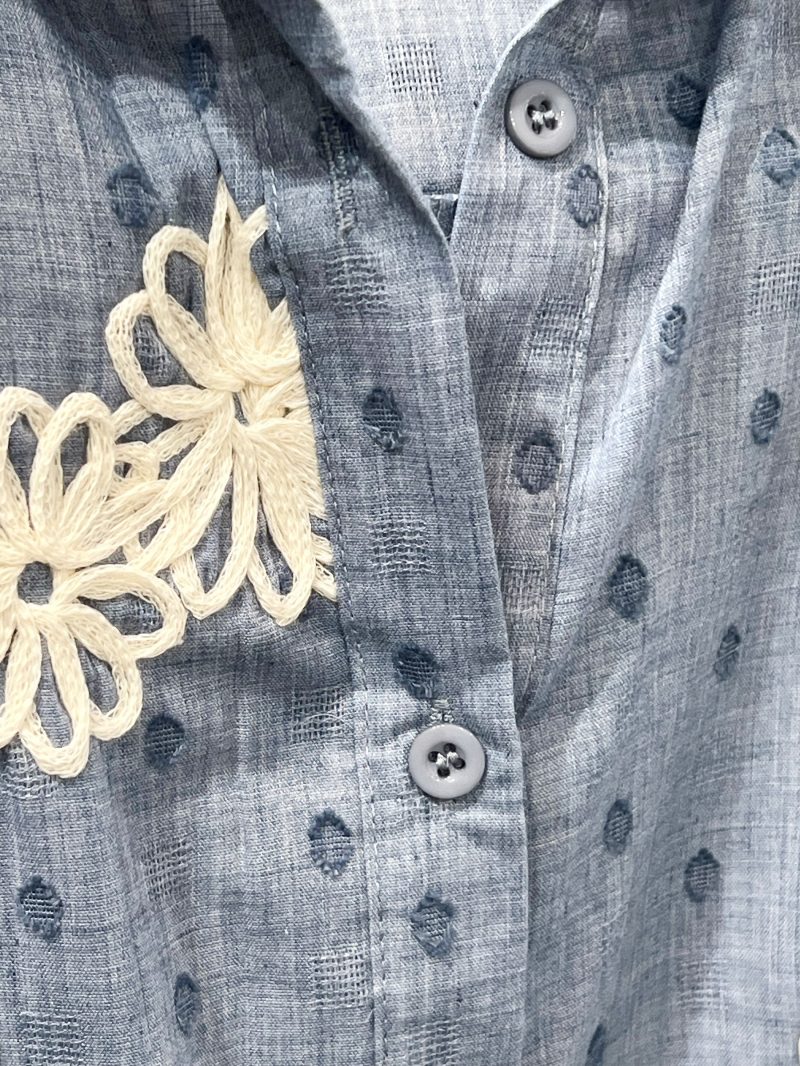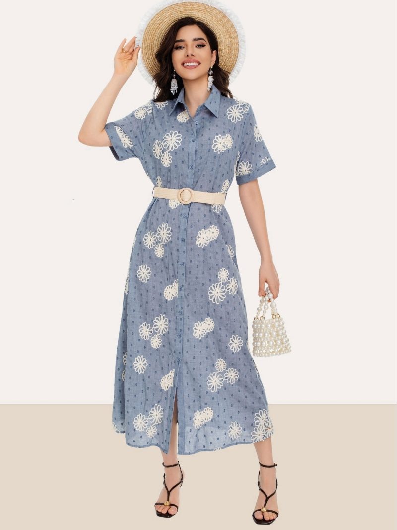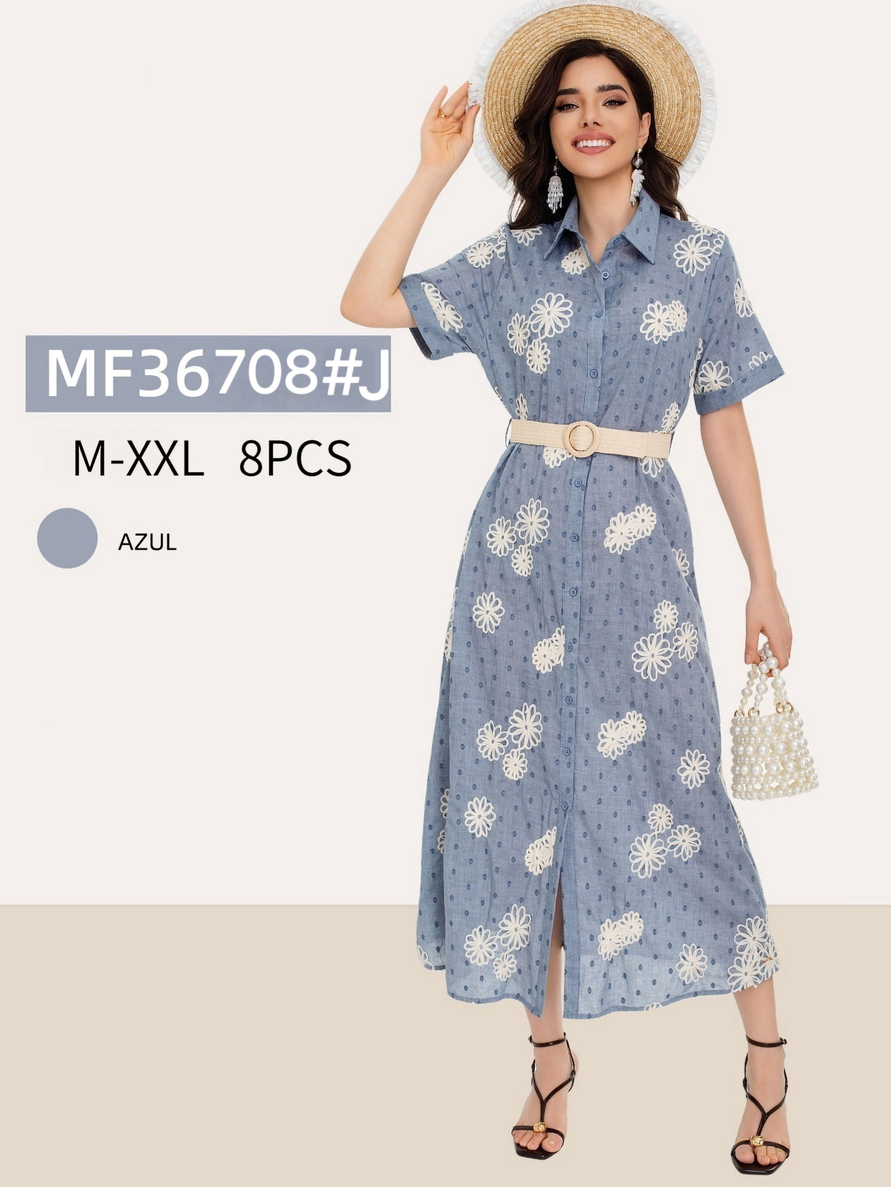 Vestido camisero bordado. Cuello solapa. Manga corta. Cierre frontal mediante botones. Abertura delantera.
