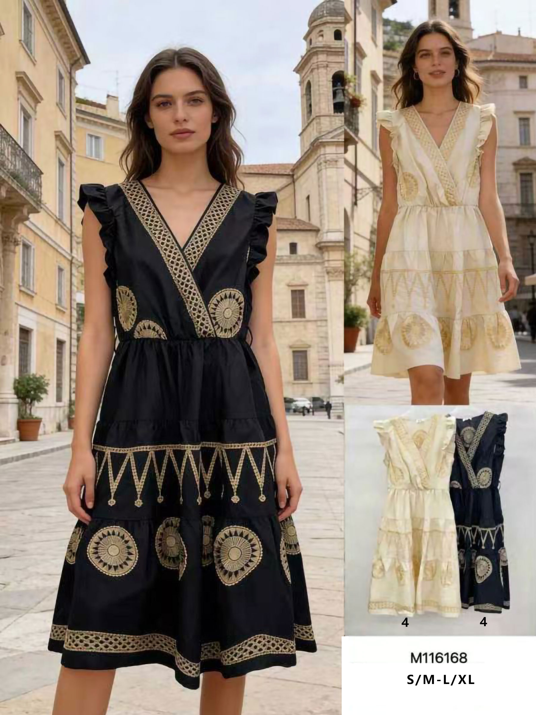 Vestido corto volantes y detalles bordados dorados