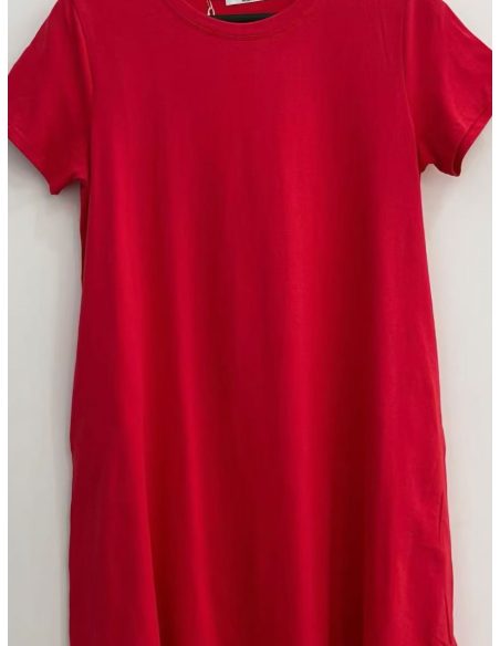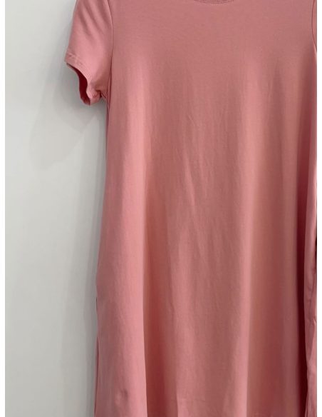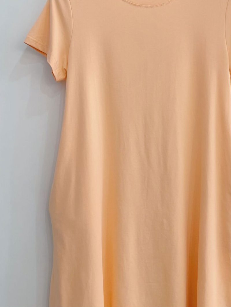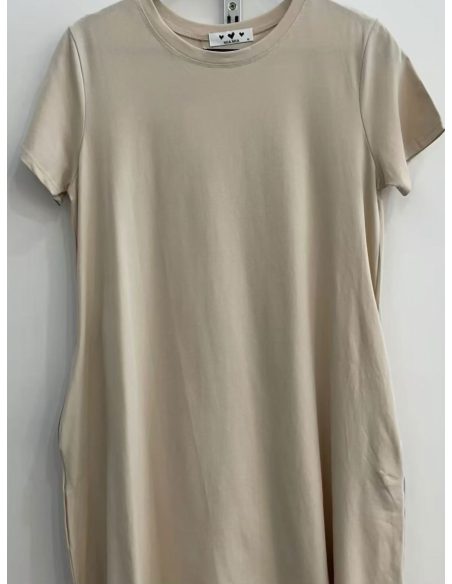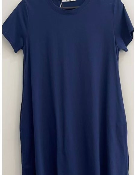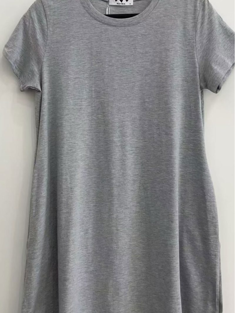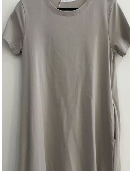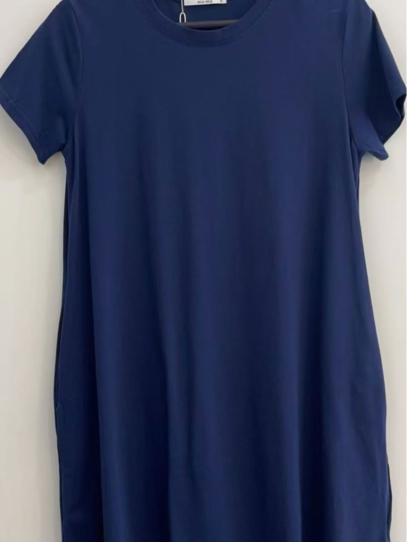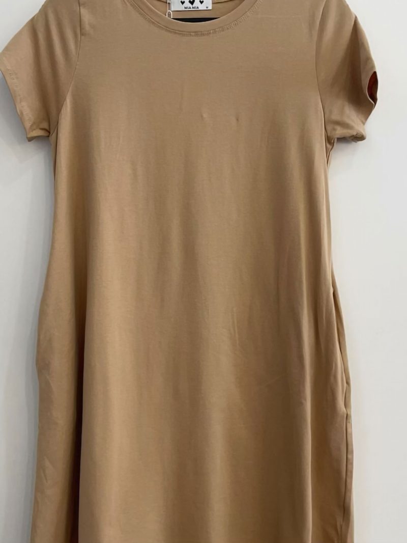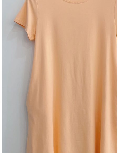 Vestido evasé. Cuello redondo. Manga corta. Bolsillos laterales. Tejido elástico.