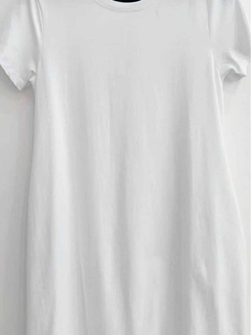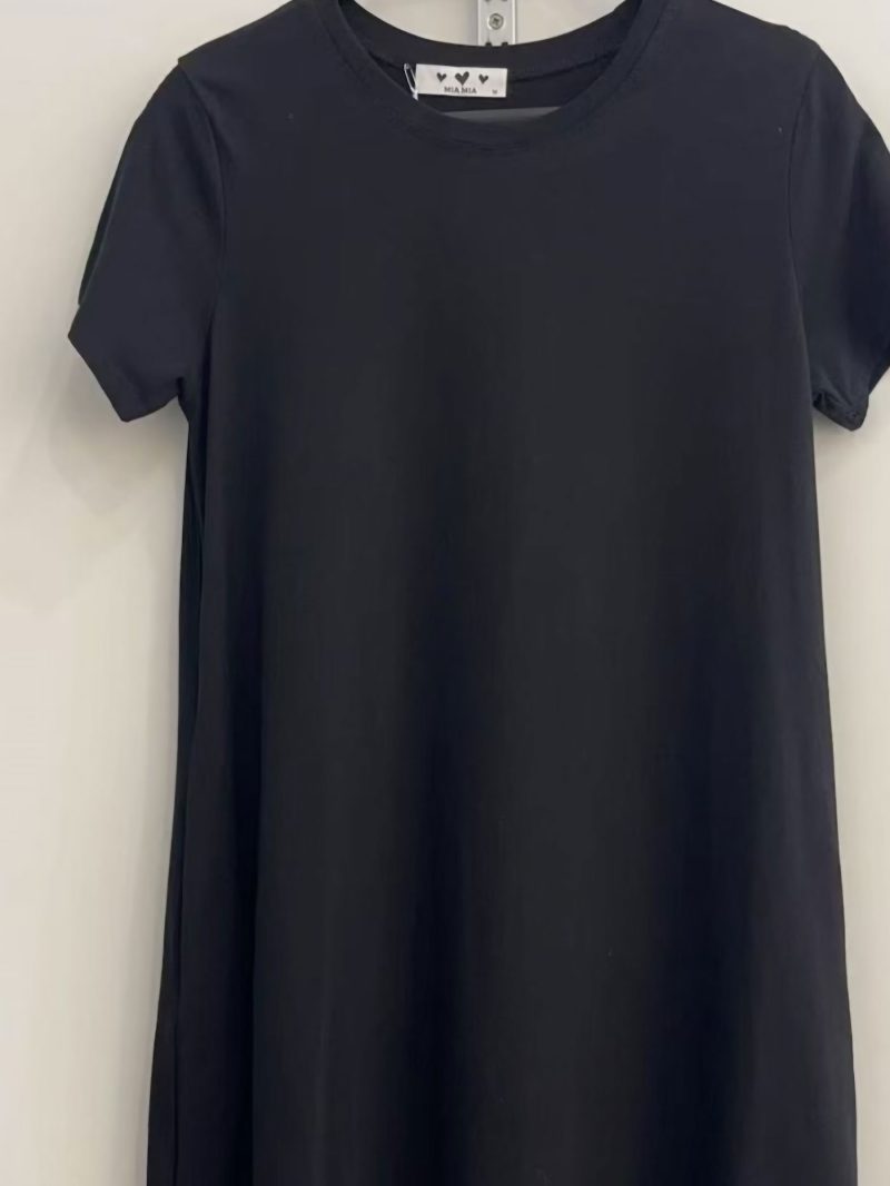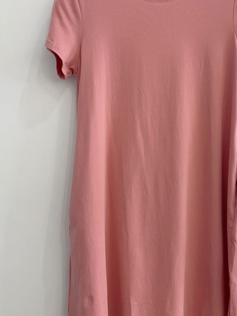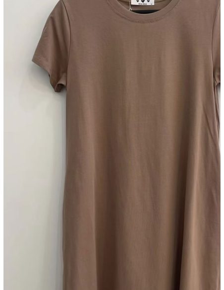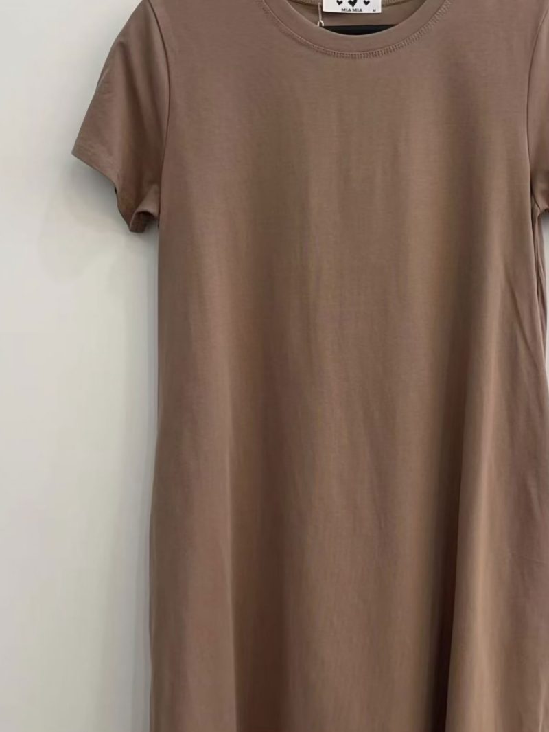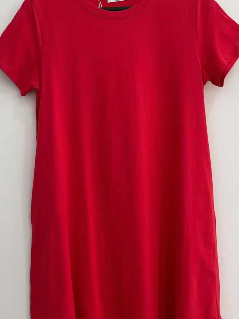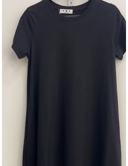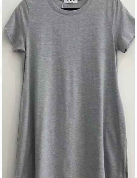 Vestido evasé. Cuello redondo. Manga corta. Bolsillos laterales. Tejido elástico.