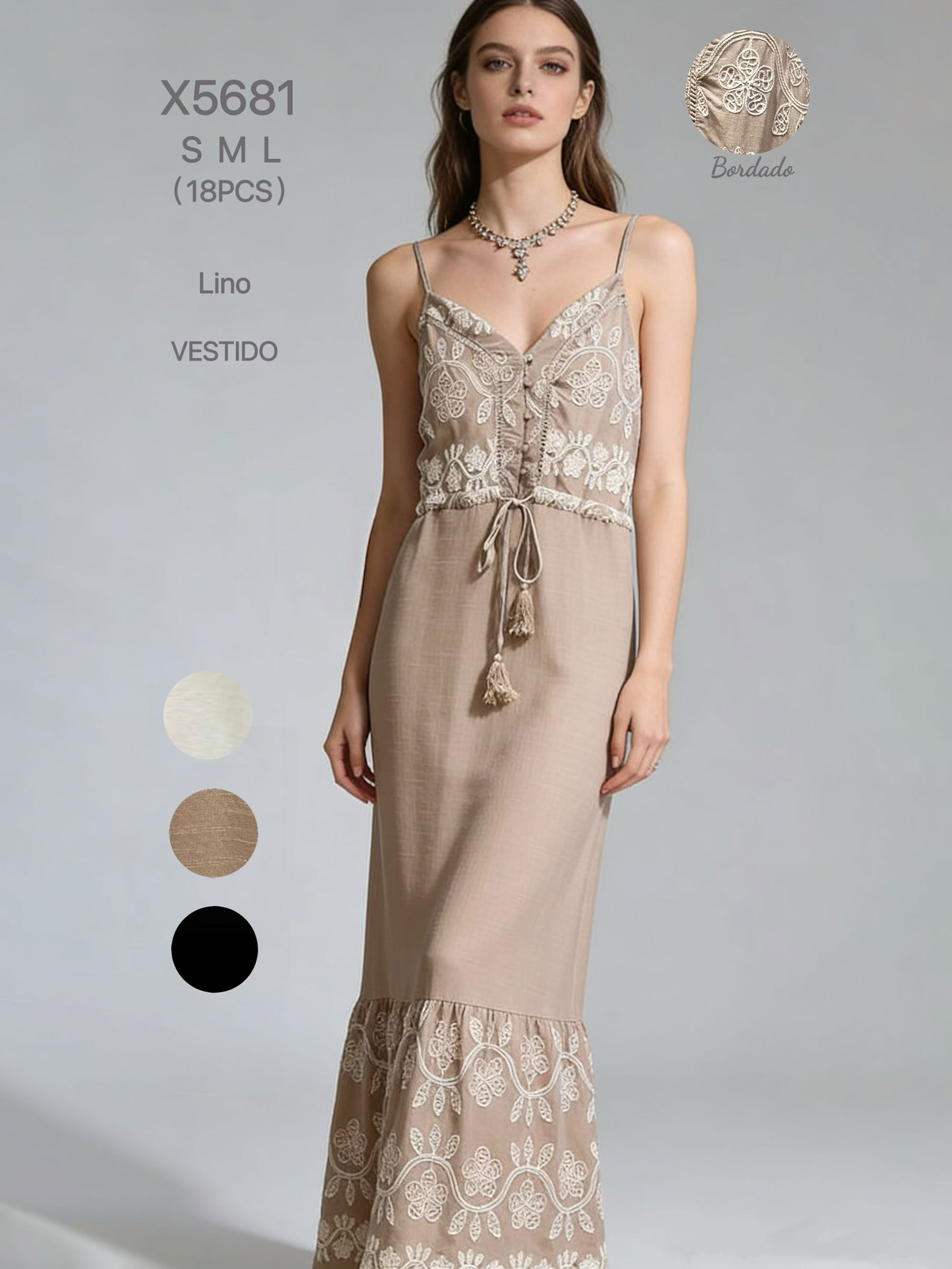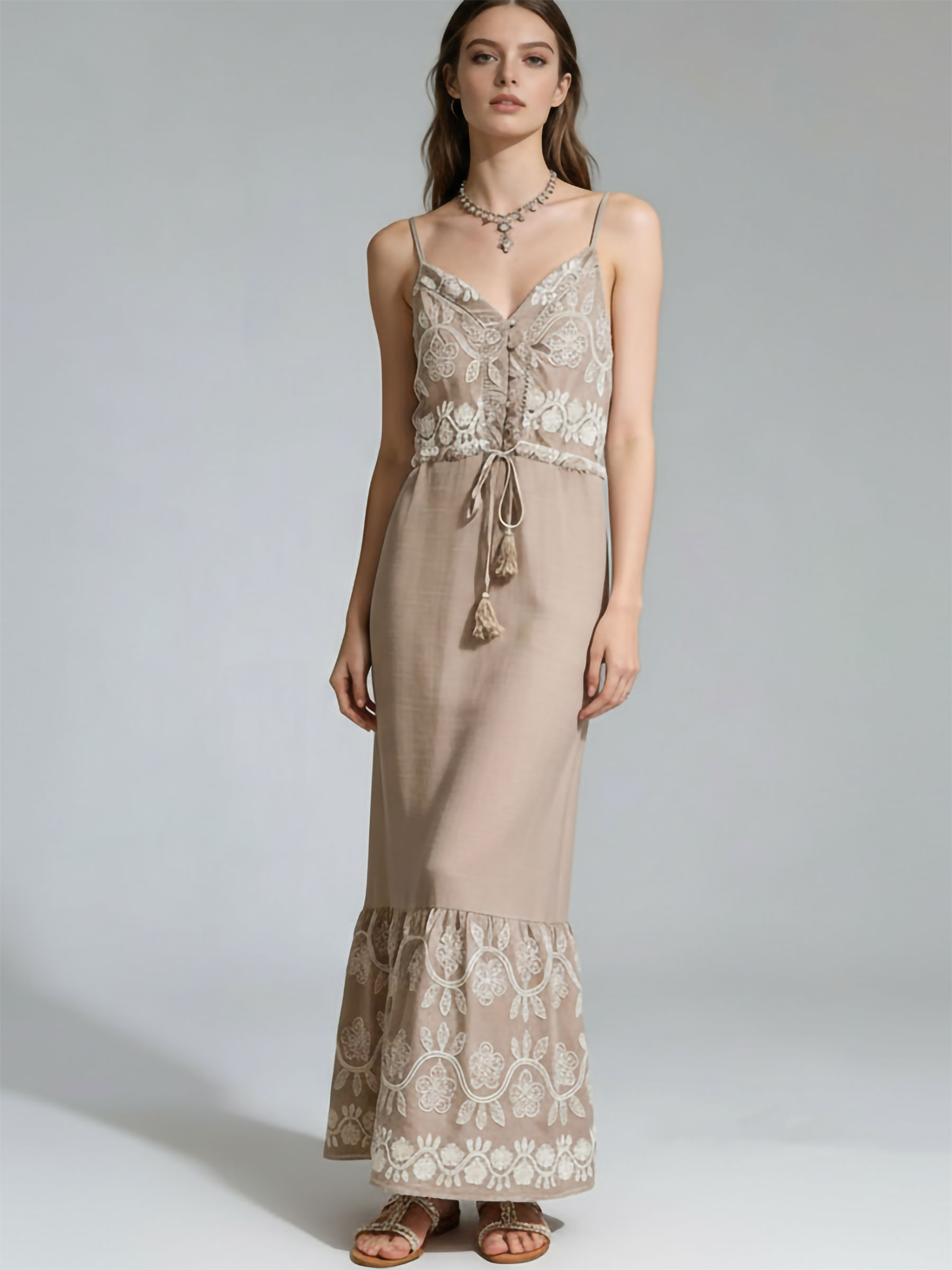 Vestido largo efecto lino bordado y cintura ajustable con borlas