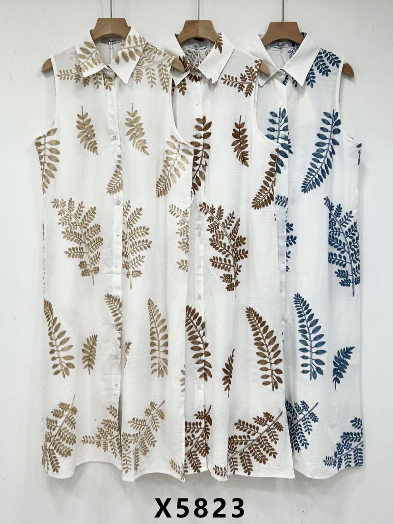 Vestido camisero sin mangas bordado hojas con cinturón