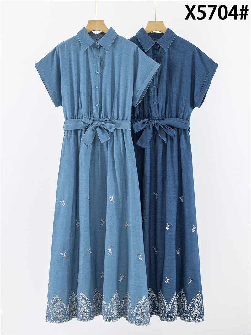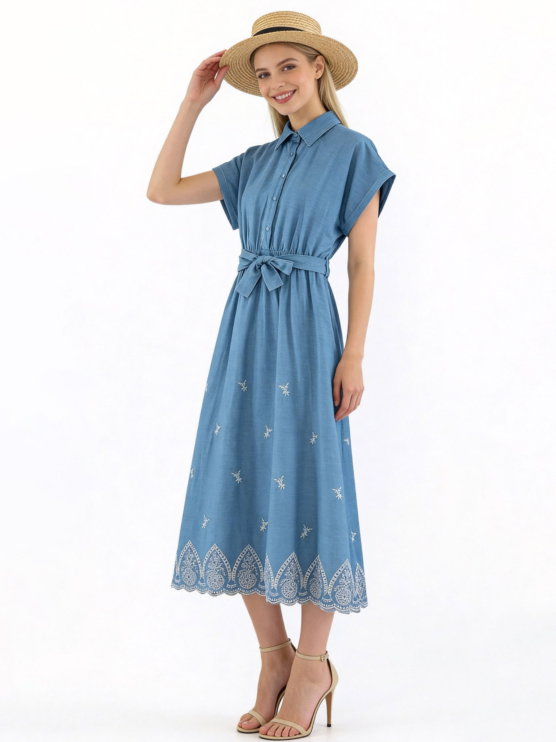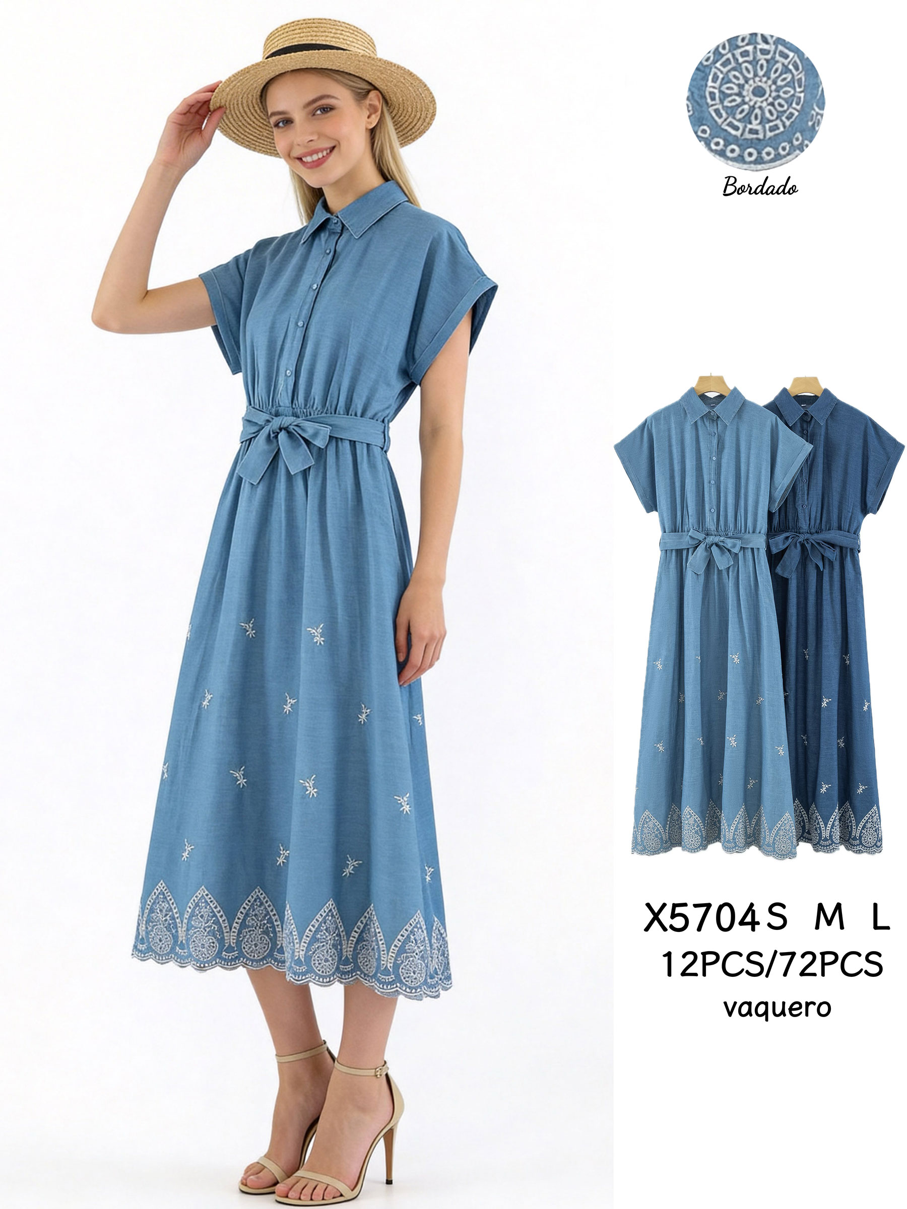 Vestido camisero símil denim bordado con cinturón