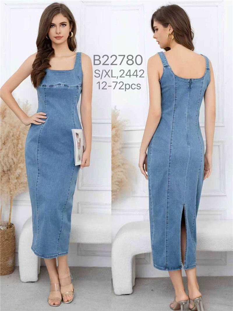 Vestido vaquero midi. Diseño entallado. Escote cuadrado. Sin mangas. Cierre trasero con cremallera. Abertura trasera.