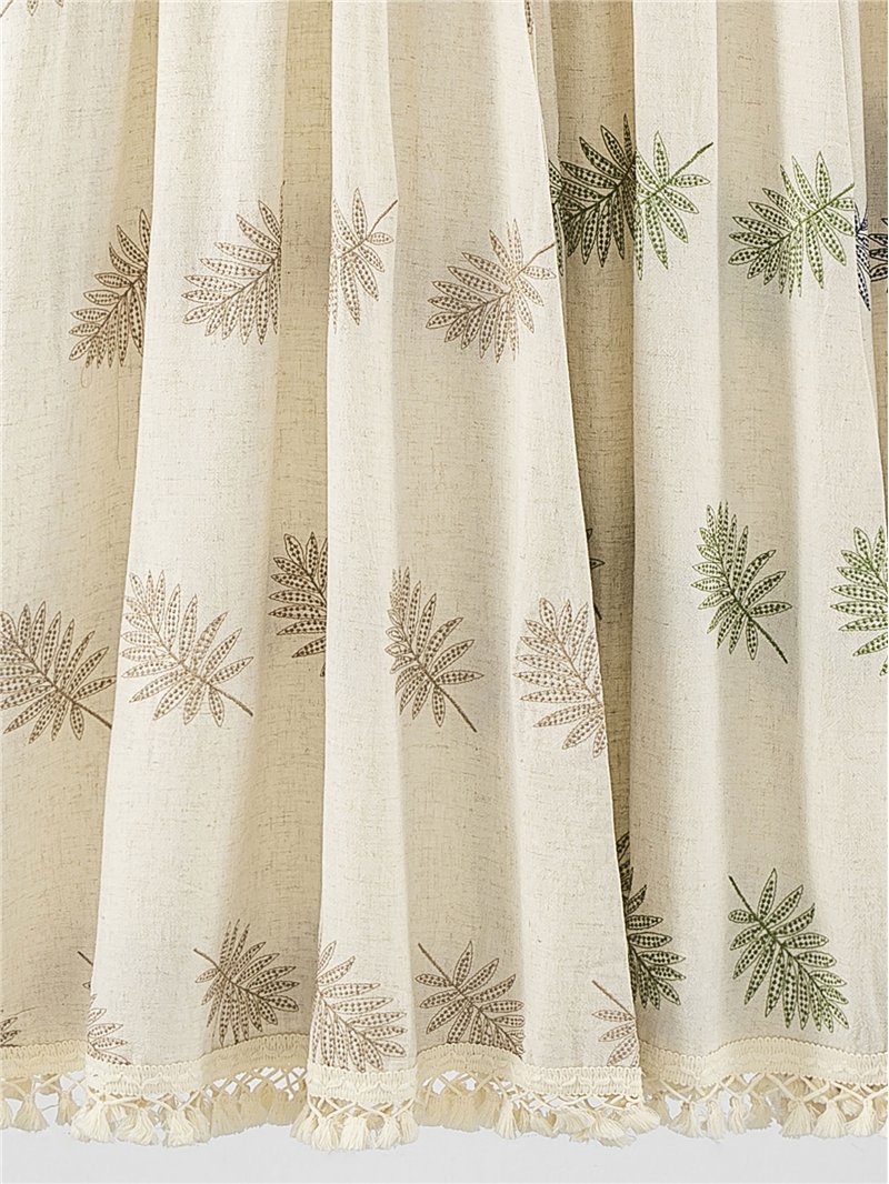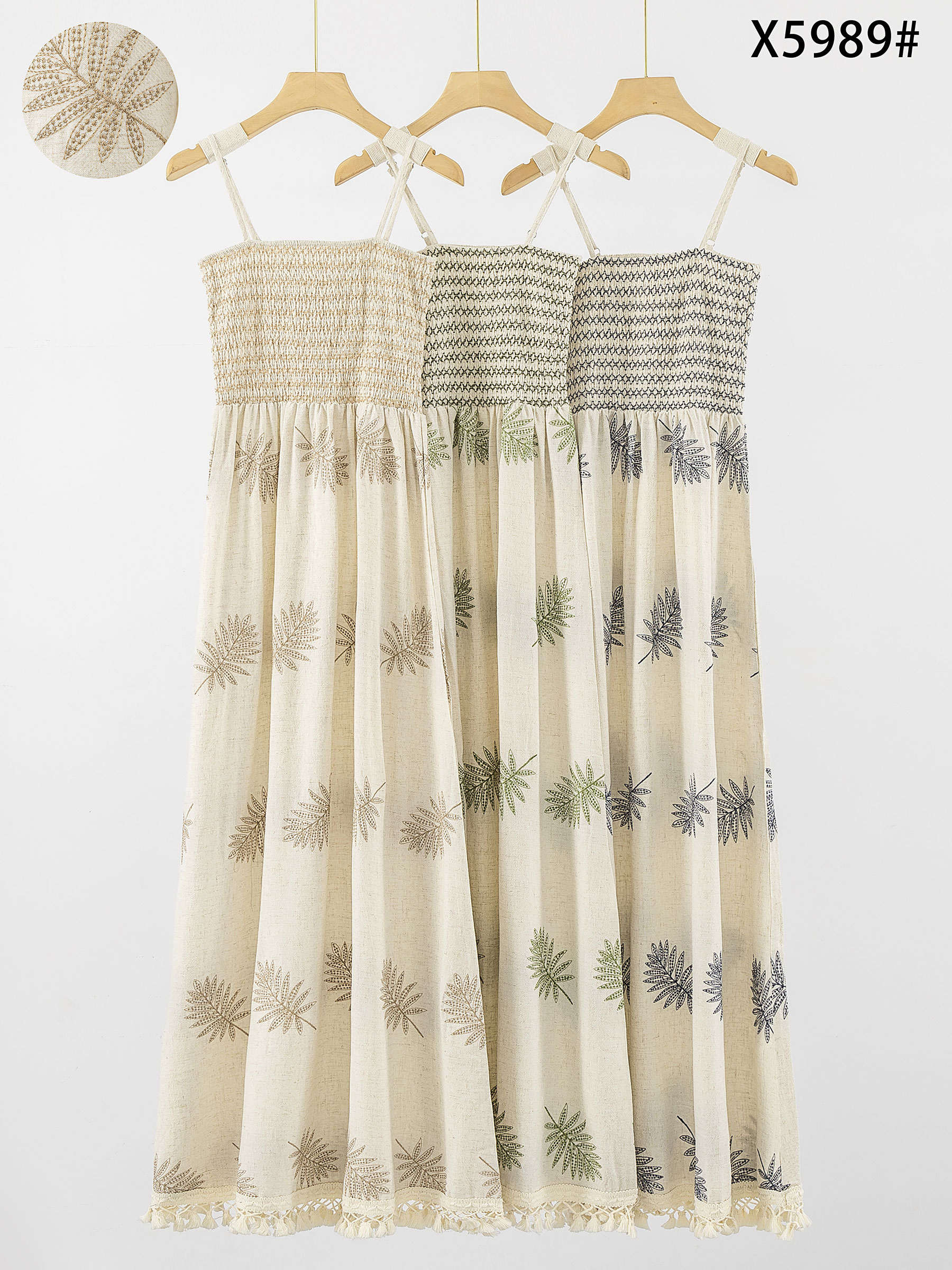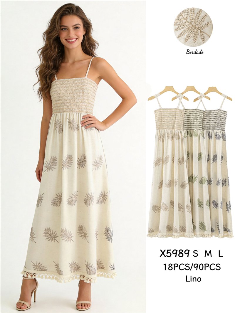 Vestido boho largo de lino con hojas bordadas