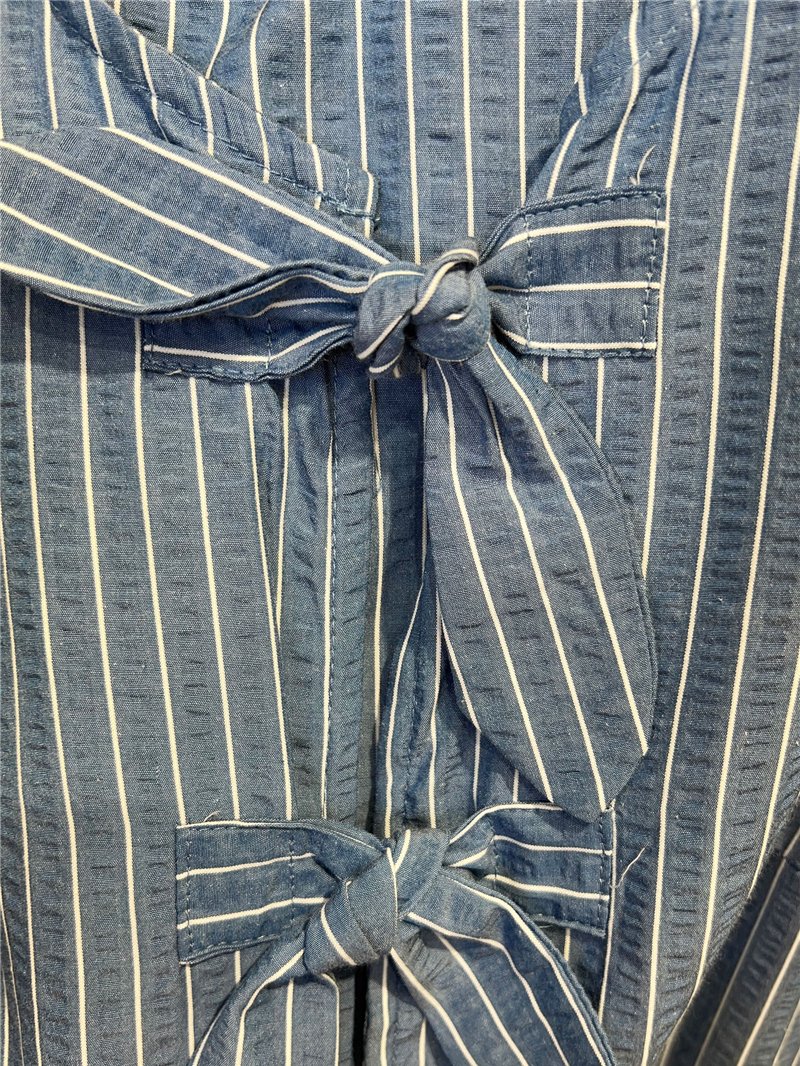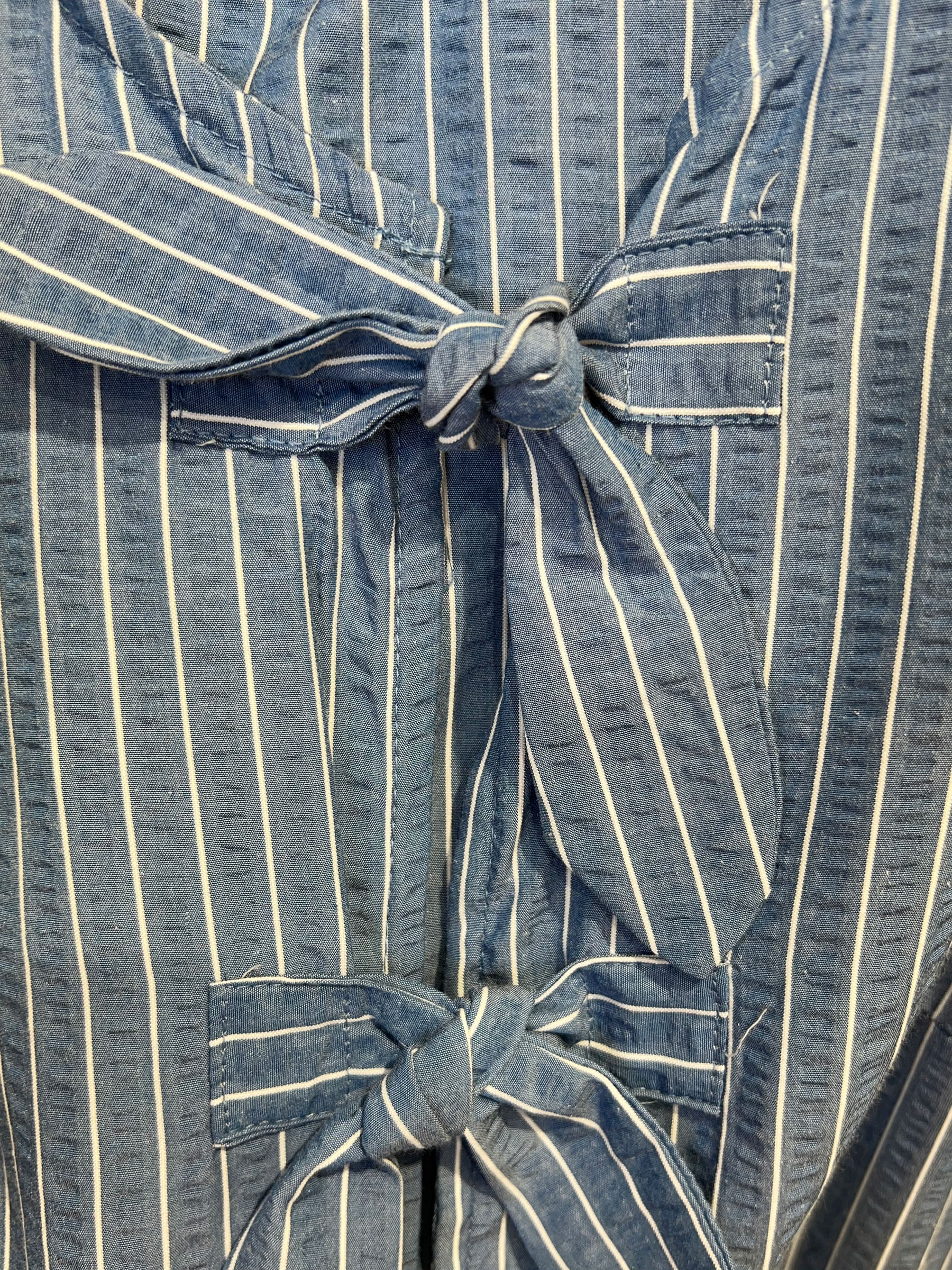 Vestido corto de rayas. Detalle lazos frontales. Cuello redondo. Sin mangas. Falda con vuelo.