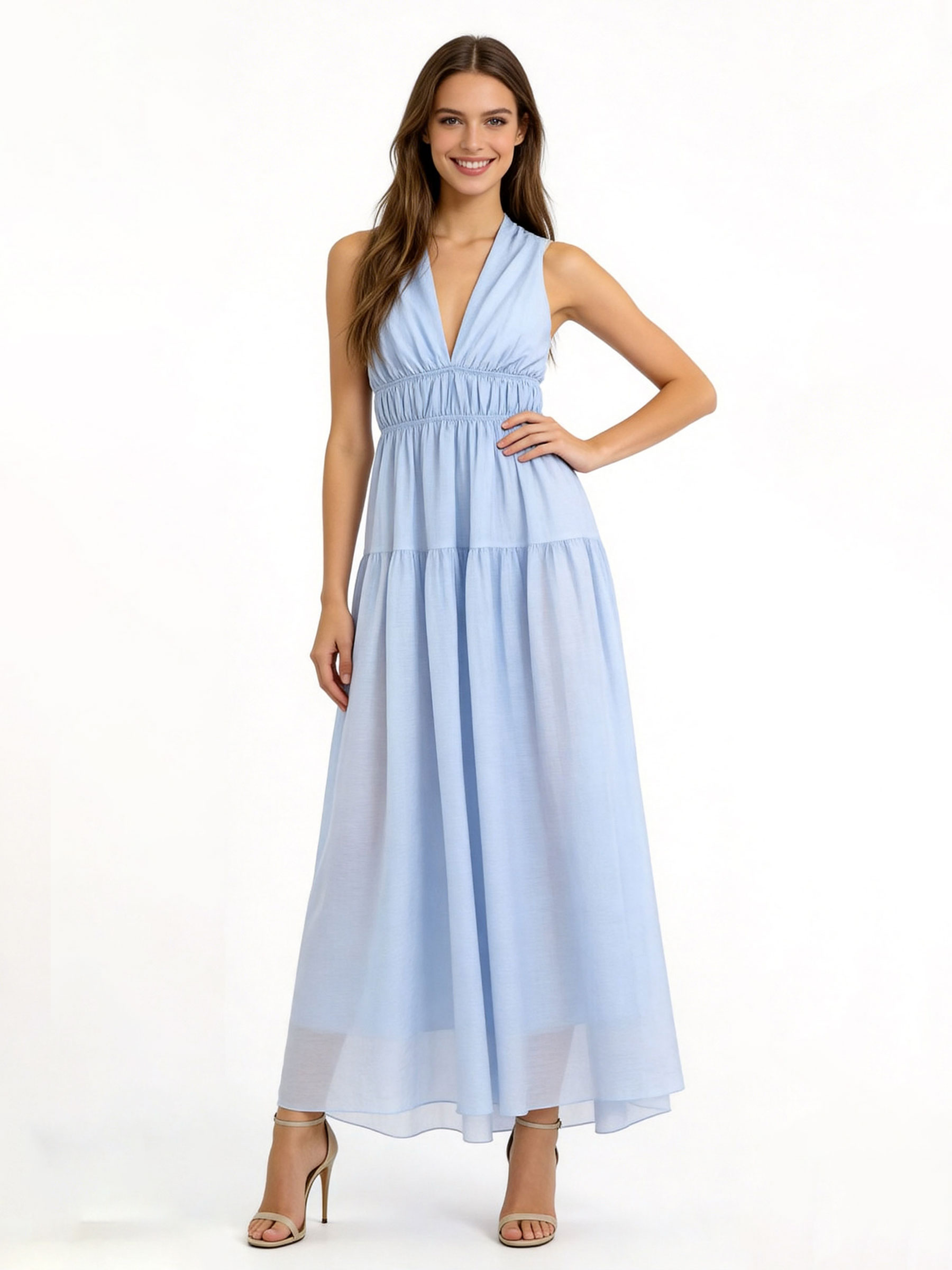 Vestido largo. Escote halter. Espalda descubierta con lazada. Cintura fruncida. Falda escalonada. Tejido ligero.