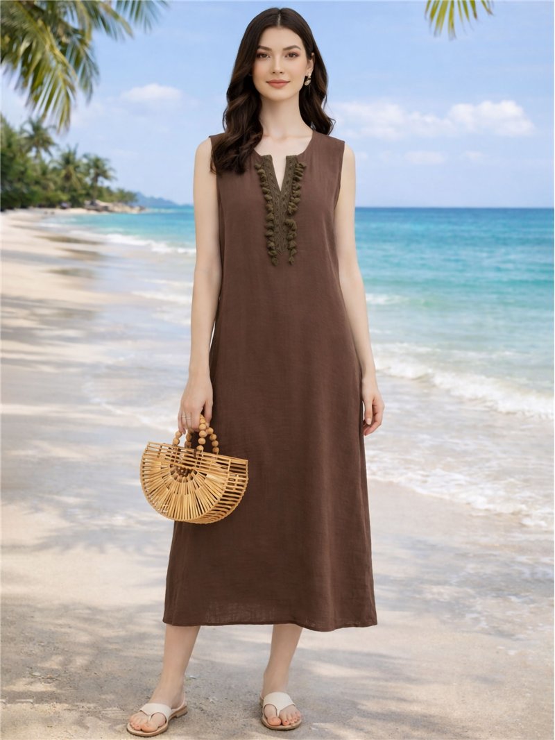 Vestido midi recto sin mangas con detalle borlas