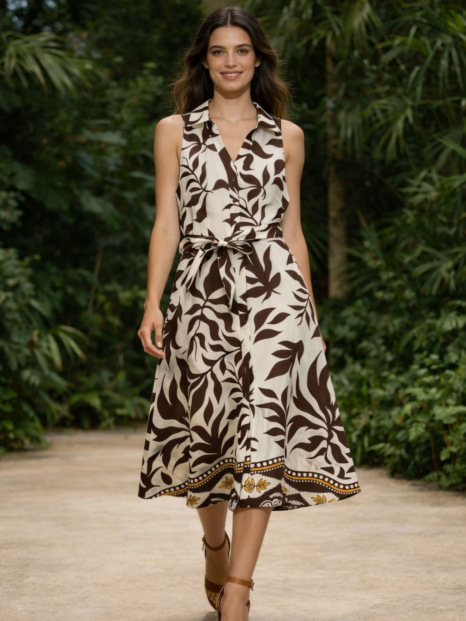 Vestido camisero midi tropical con cinturón