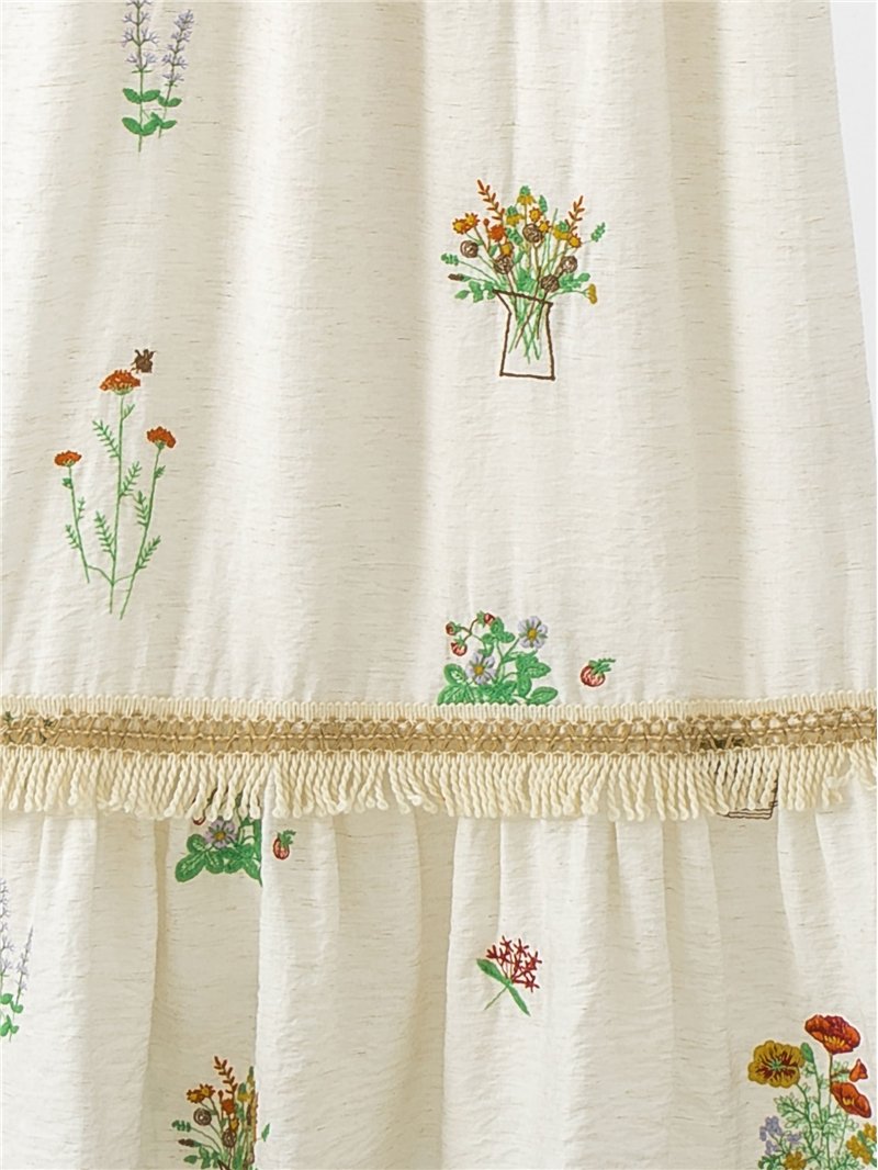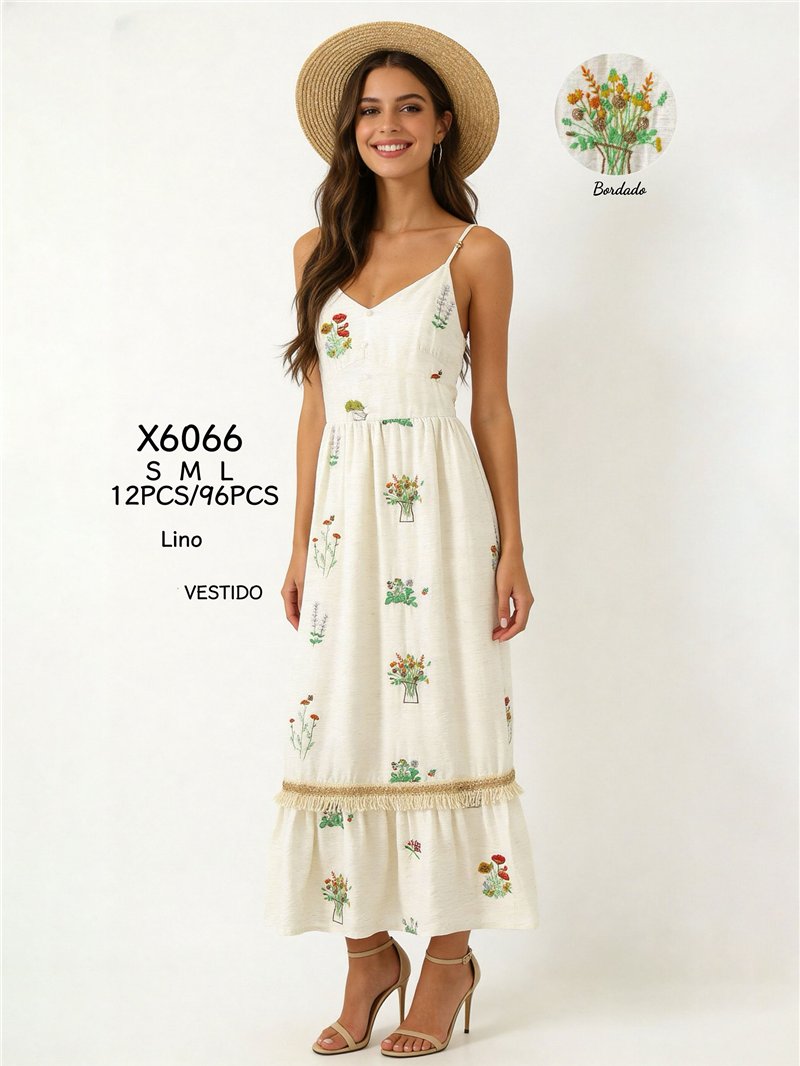 Vestido midi de lino con tirantes finos ajustables, bordados florales multicolor y detalle de flecos en el bajo.