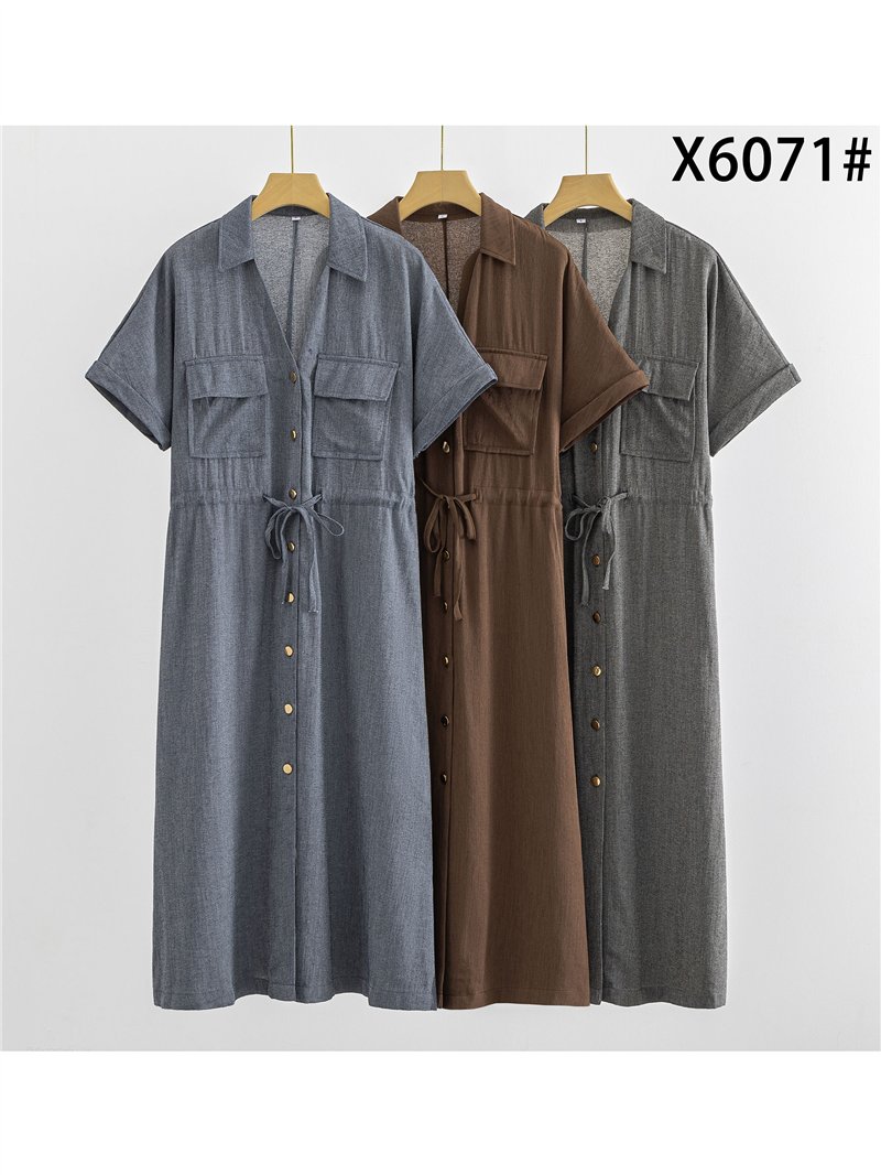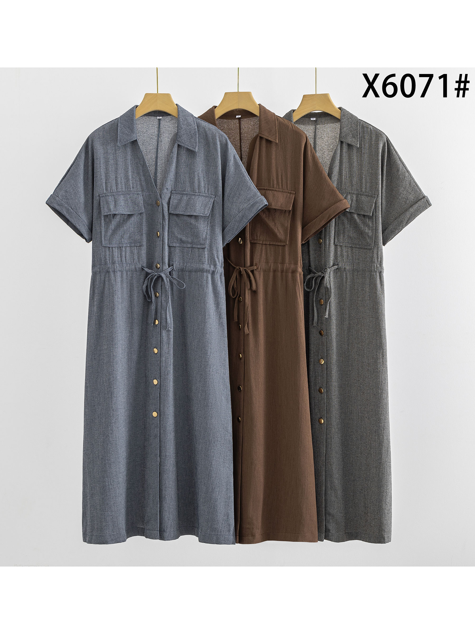 Vestido camisero midi efecto lino con manga corta vuelta, bolsillos de solapa y cintura ajustable con cordón.